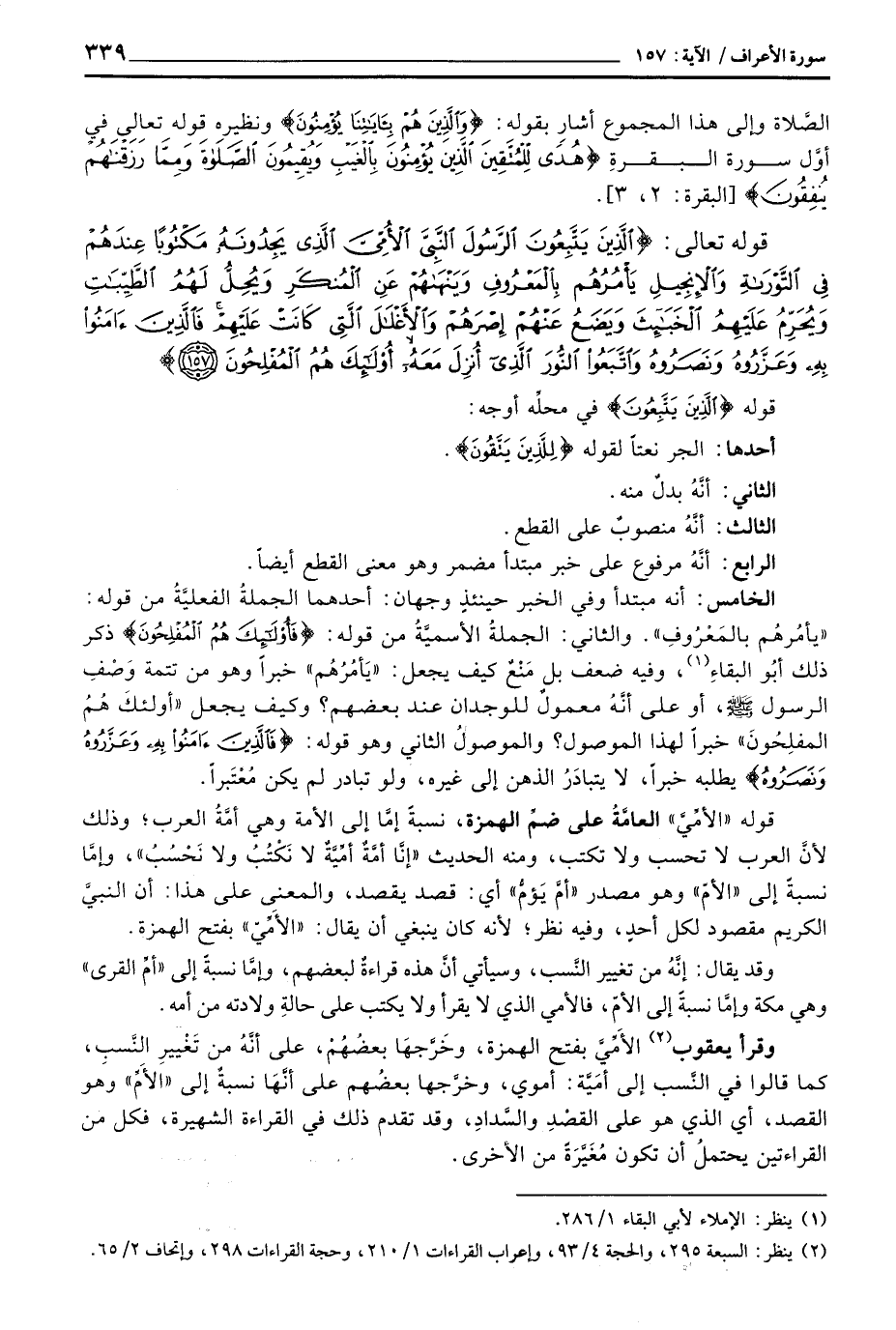 قوله «الأمِّيَّ» العامَّةُ على ضمِّ الهمزة، نسبةً إمَّا إلى الأمة وهي أمَّةُ العرب؛ وذلك لأن العرب لا تحسب ولا تكتب، ومنه الحديث «أنَّا أمَّةٌ أمِّيَّةٌ لا نَكْتُبُ ولا نَحْسُبُ» ، وإمَّا نسبةً إلى «الأمّ» وهو مصدر «أمَّ يَؤمُّ» أي: قصد يقصد، والمعنى على هذا: أن النبيَّ الكريم مقصود لك أحدٍ، وفيه نظر؛ لأنه كان ينبغي أن يقال: «الأَمِّيّ» بفتح الهمزة.