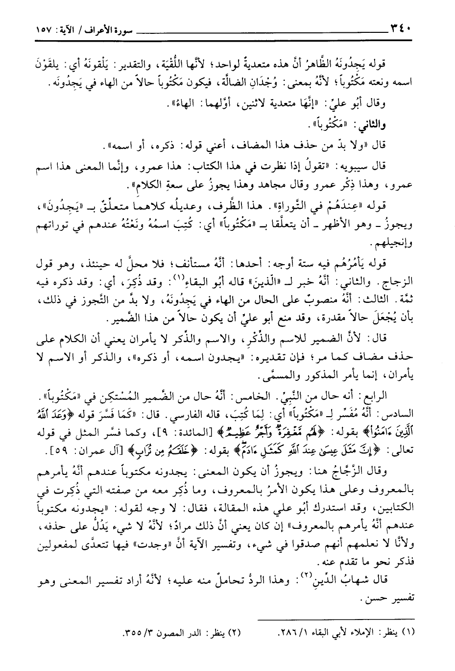 الرابع: أنه حال من النَّبِيِّ. الخامس: أنَّهُ حال من الضَّمير المُسْتكِن في «مَكْتُوباً» . السادس: أنَّهُ مُفَسِّر لِ «مَكْتُوباً» أي: لِمَا كُتِبَ، قاله الفارسي. قال: «كَمَا فَسَّرَ قوله {وَعَدَ الله الذين آمَنُواْ} [المائدة: 9] [النور: 55] [الفتح: 29] بقوله: {لَهُم مَّغْفِرَةٌ وَأَجْرٌ عَظِيمٌ} [المائدة: 9] ، وكما فسَّر المثل في قوله تعالى: {إِنَّ مَثَلَ عيسى عِندَ الله كَمَثَلِ آدَمَ} [آل عمران: 59] بقوله: {خَلَقَهُ مِن تُرَابٍ} [آل عمران: 59] .