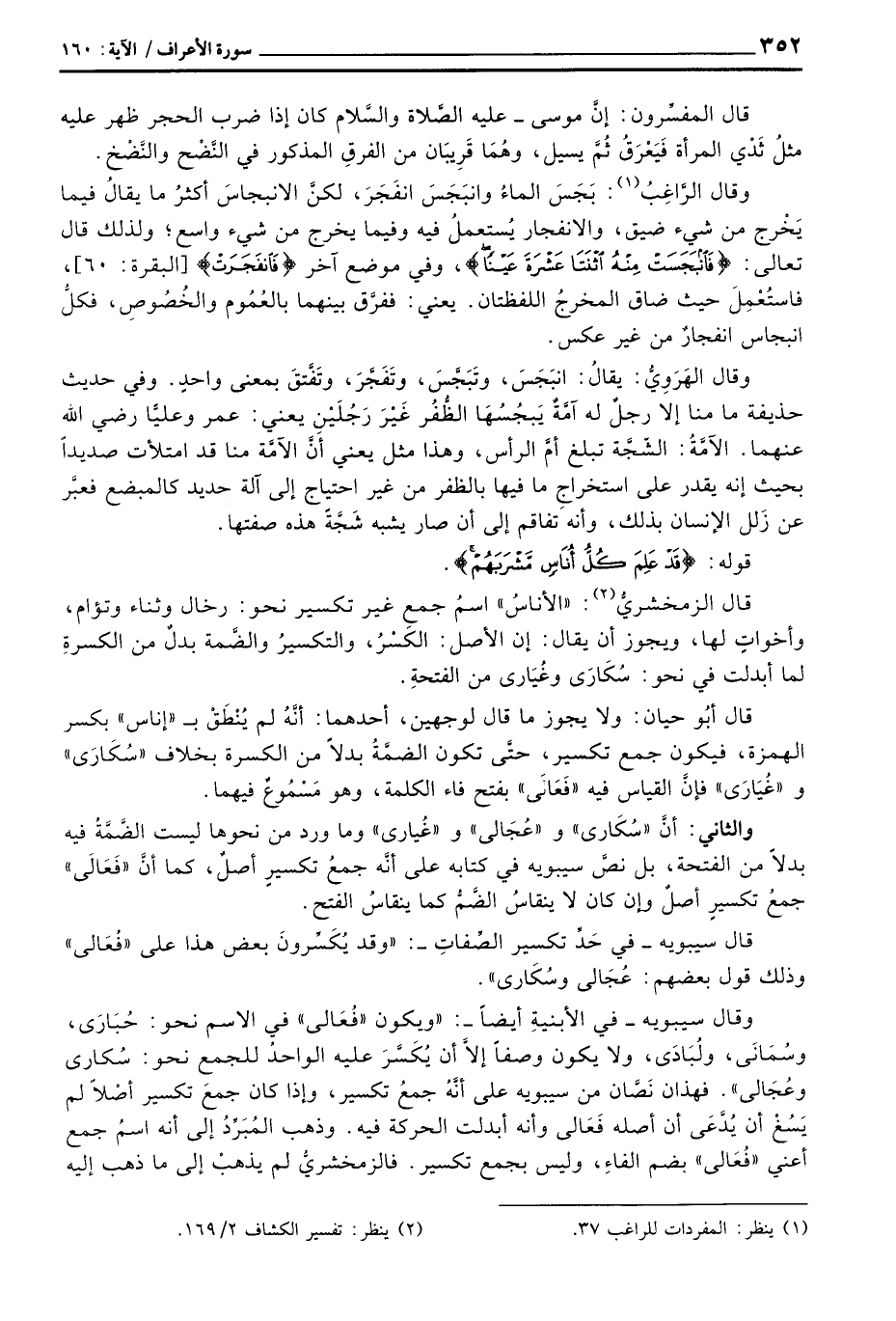 قال المفسِّرون: إنَّ موسى - عليه الصَّلاة والسَّلام كان إذا ضرب الحجر ظهر عليه مثلُ ثَدْي المرأة فَيَعْرَقُ ثُمَّ يسيل، وهُمَا قَرِيبَان من الفرقِ المذكور في النَّضْح والنَّضْخ.
