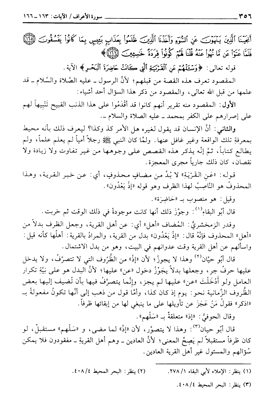 وقدر الزمخشريُّ: المُضاف «أهل» أي: عن أهل القرية، وجعل الظرف بدلاً من «أهل» المحذوف فإنَّهُ قال: «إذْ يَعْدُون» بدل من القرية، والمرادُ بالقرية: أهلُها كأنه قيل: واسألهم عن أهل القرية وقت عدوانهم في البيت، وهو من بدل الاشتمال.