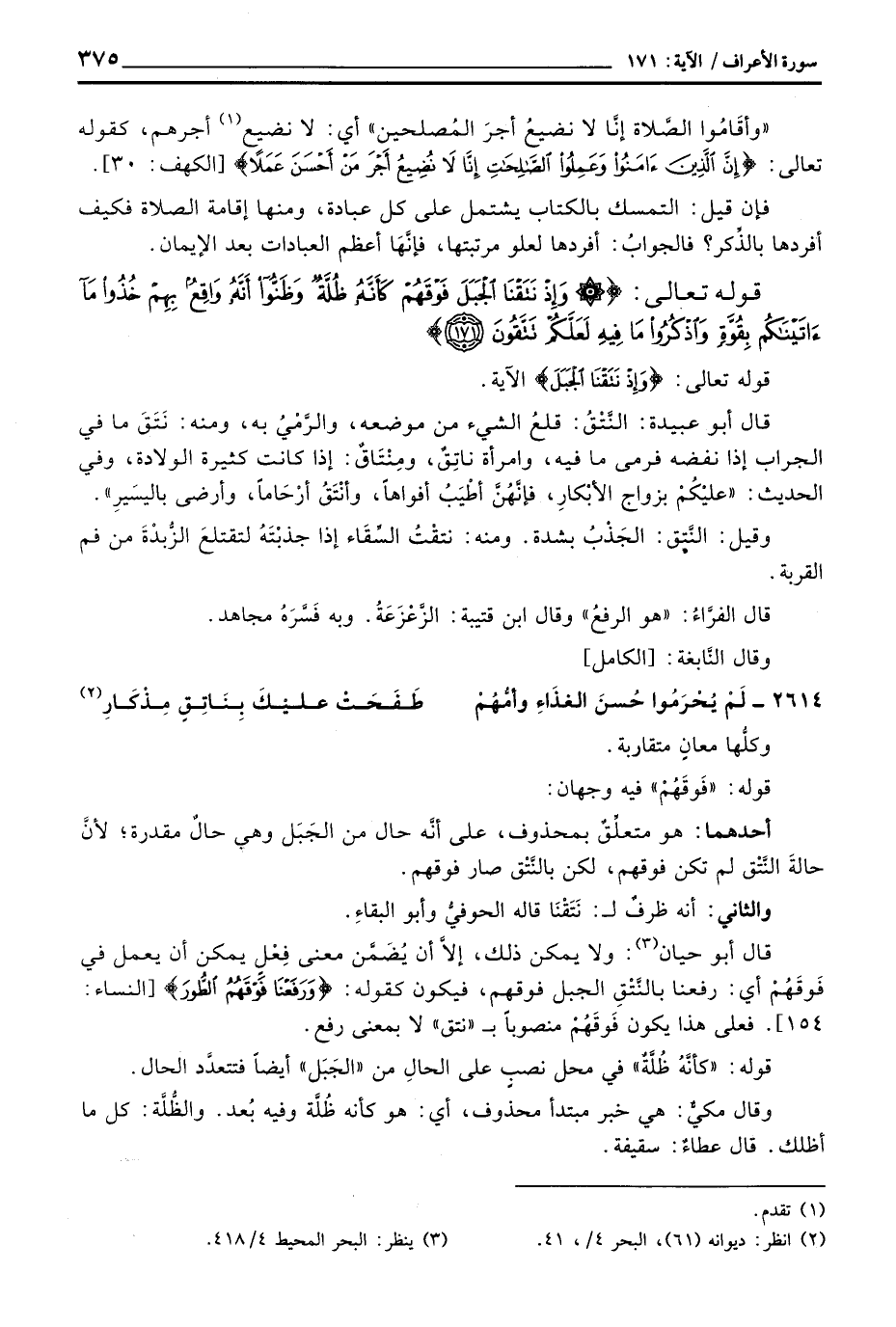 قال أبو حيان: ولا يمكن ذلك، إلاَّ أن يُضَمَّن معنى فِعْلِ يمكن أن يعمل في فَوقَهُمْأي: رفعنا بالنَّتْقِ الجبل فوقهم، فيكون كقوله: {وَرَفَعْنَا فَوْقَهُمُ الطور} [النساء: 154] . فعلى هذا يكون فَوقَهُمْ منصوباً ب «نتق» لا بمعنى رفع.