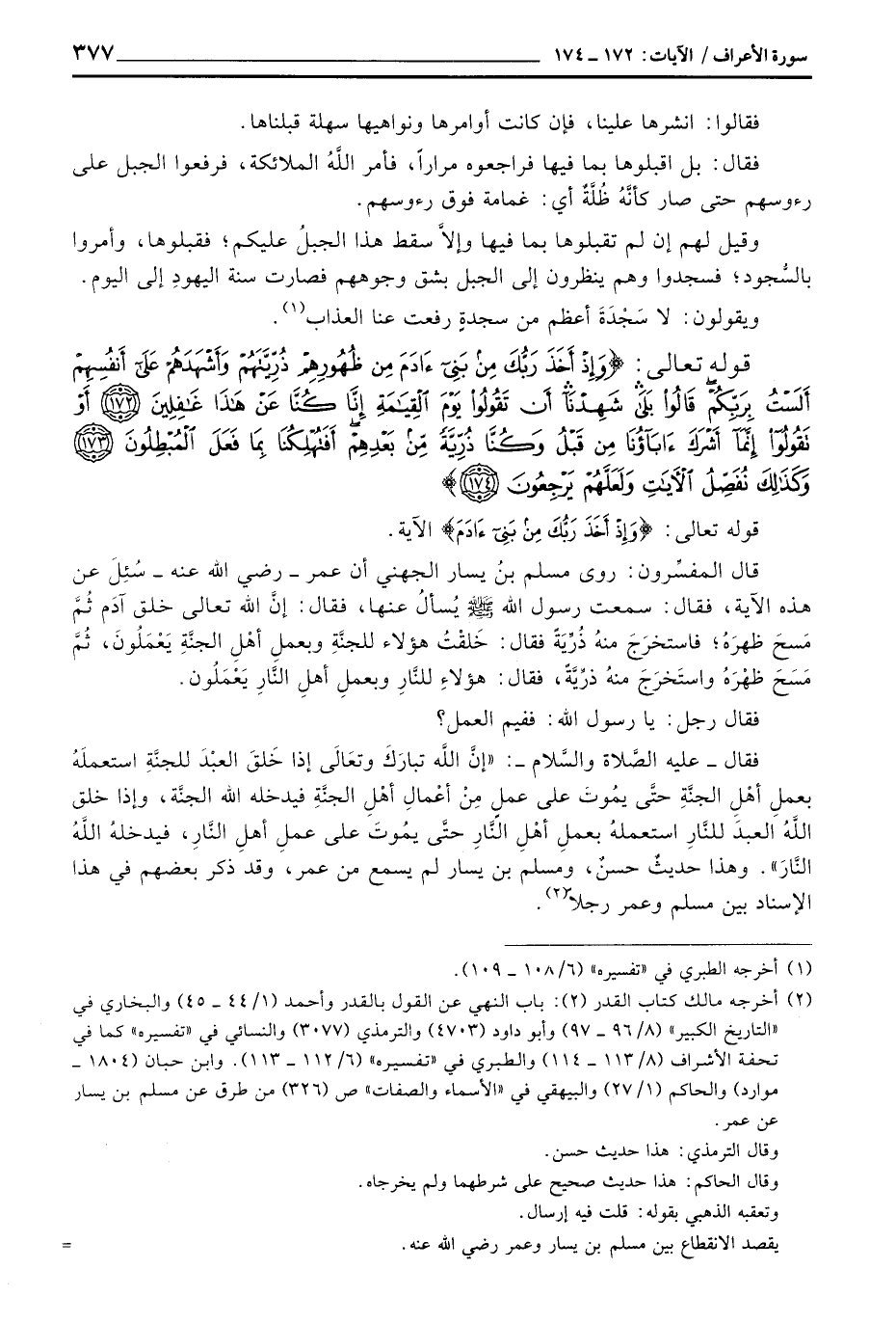 قال المفسِّرون: روى مسلم بنُ يسار الجهني أن عمر - رَضِيَ اللَّهُ عَنْه - سُئِلَ عن هذه الآية، فقال: «سمعت رسول الله صَلَّى اللَّهُ عَلَيْهِ وَسَلَّم َ يُسألُ عنها، فقال: إنَّ الله تعالى خلق آدَم ثُمَّ مَسحَ ظهرَهُ؛ فاستخرَجَ منهُ ذُرِّيَةً فقال: خَلقْتُ هؤلاء للجنَّةِ وبعمل أهْلِ الجنَّةِ يَعْمَلُونَ، ثُمَّ مَسَحَ