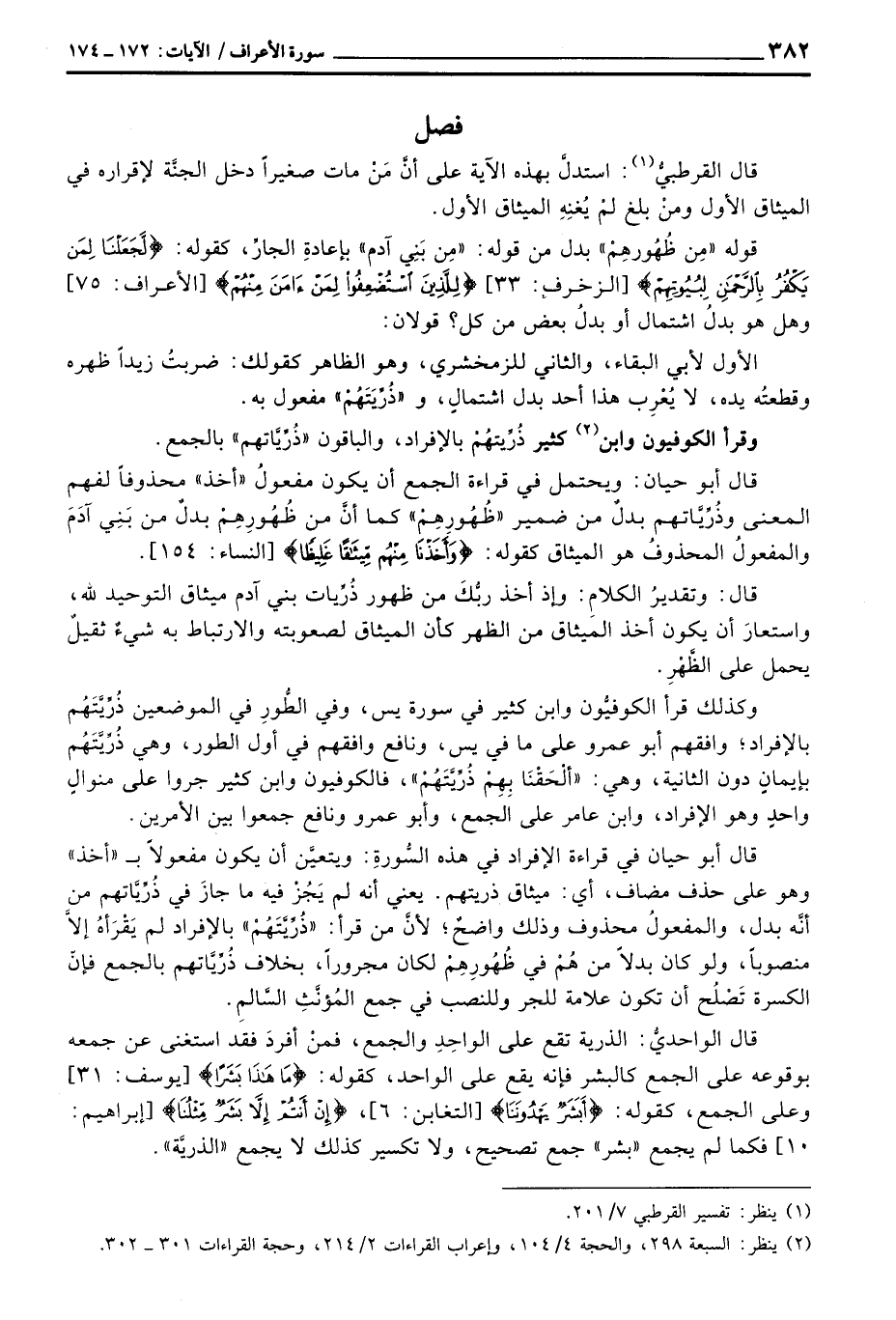قال أبو حيان في قراءة الإفراد في هذه السُّورةِ: ويتعيَّن أن يكون مفعولاً ب «أخذ» وهو على حذف مضاف، أي: ميثق ذريتهم. يعني أنه لم يَجُزْ فيه ما جازَ في ذُرِّيَاتهم من أنَّه بدل، والمفعولُ محذوف وذلك واضحٌ؛ لأنَّ من قرأ: «ذُرِّيَّتَهُمْ» بالإفراد لم يَقْرَأهُ إلاَّ منصوباً، ولو كان بدلاً من هُمْ في ظُهُورِهِمْ لكان مجرورً، بخلاف ذُرِّيَّاتهم بالجمع فإنَّ الكسرة تَصْلُح أن تكون علامة للجر وللنصب في جمع المُؤنَّثِ السَّالمِ.