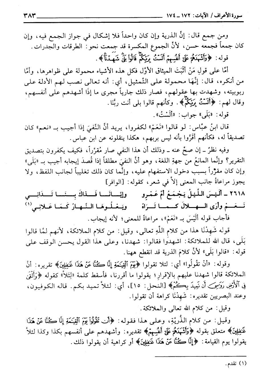 قوله شَهِدْنضا هذا من كلامِ اللَّهِ تعالى، وقيل: من كلام الملائكة، لأنهم لمَّا قالوا بَلَى، قال الله للملائكة: اشهدوا فقال: شهدنا، وعلى هذا القول يحسن الوقف على قوله: «قالوا بَلَى» لأن كلامَ الذرية قد انقطع ههنا.