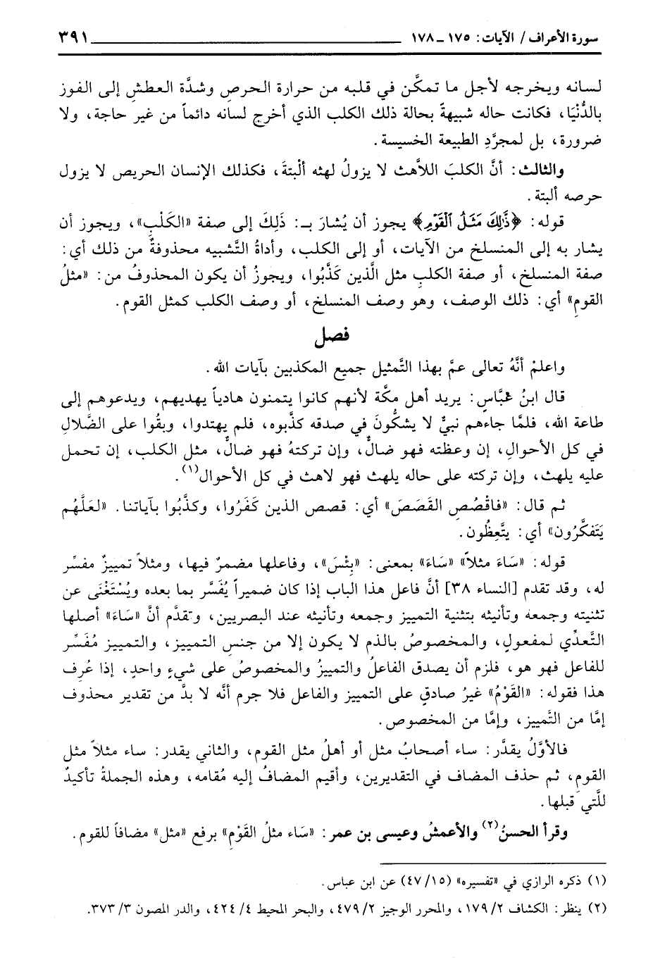 قوله: {ذَّلِكَ مَثَلُ القوم} يجوز أن يُشارَ ب: ذَلِكَ إلى صفة «الكَلْبِ» ، ويجوز أن يشار به إلى المنسلخ من الآيات، أو إلى الكلب، وأداةُ التَّشبيه محذوفةٌ من ذلك أي: صفة المنسلخ، أو صفة الكلبِ مثل الَّذين كَذَّبُوا، ويجوزُ أن يكون المحذوفُ من: «مثلُ القومِ» أي: ذلك الوصف، وهو وصف المنسلخ، أو وصف الكلب كمثل القوم.