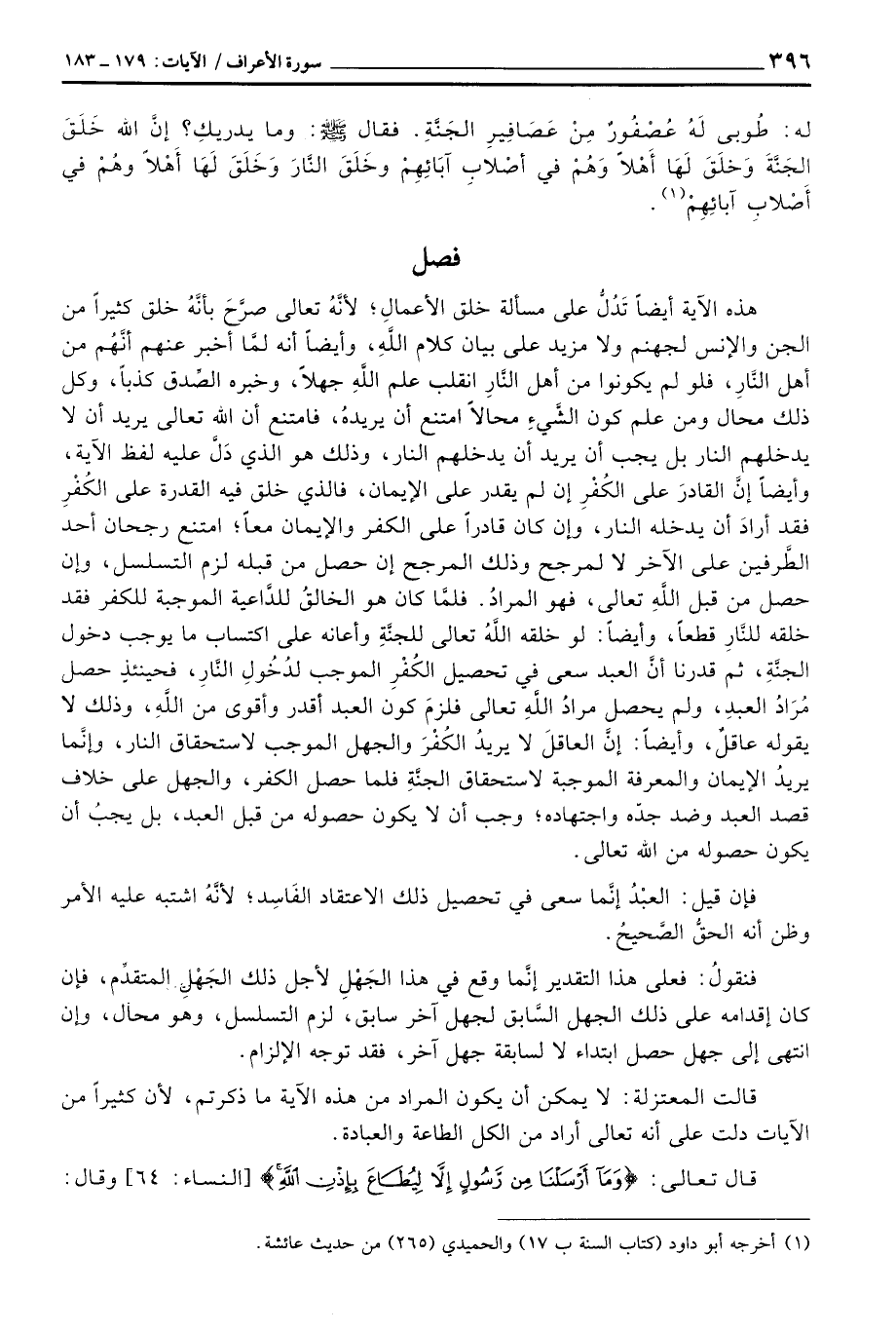 هذه الآية أيضاً تَدُلُّ على مسألة خلق الأعمالِ لأنَّهُ تعالى صرَّحَ بأنَّهُ خلق كثيراً من الجن والإنس لجهنم ولا مزيد على بيان كلام اللَّهِ، وأيضاً انه لمَّا أخبر عنهم أنَّهُم من أهل النَّارِ، فلو لم يكونوا من أهل النَّارِ انقلب علم اللَّهِ جهلاً، وخبره الصِّدق كذباً، وكل ذلك محال ومن علم كون الشَّيءِ محالاً امتنع أن يريدهُ، فامتنع أن الله تعالى يريد أن لا يدخلهم النار بل يجب أن يريد أن يدخلهم النار، وذلك هو الذي دَلَّ عليه لفظ الآية، وأيضاً إنَّ القادرَ على الكُفْرِ إن لم يقدر على الإيمان، فالذي خلق فيه القدرة على الكُفْرِ فقد أرادَ أن يدخله النار، وإن كان قادراً على الكفر والإيمان معاً؛ امتنع رجحان أحد الطَّرفين على الآخر لا لمرجح وذلك المرجح إن حصل من قبله لزم التسلسل، وإن حصل من قبل اللَّهِ تعالى، فهو المرادُ.