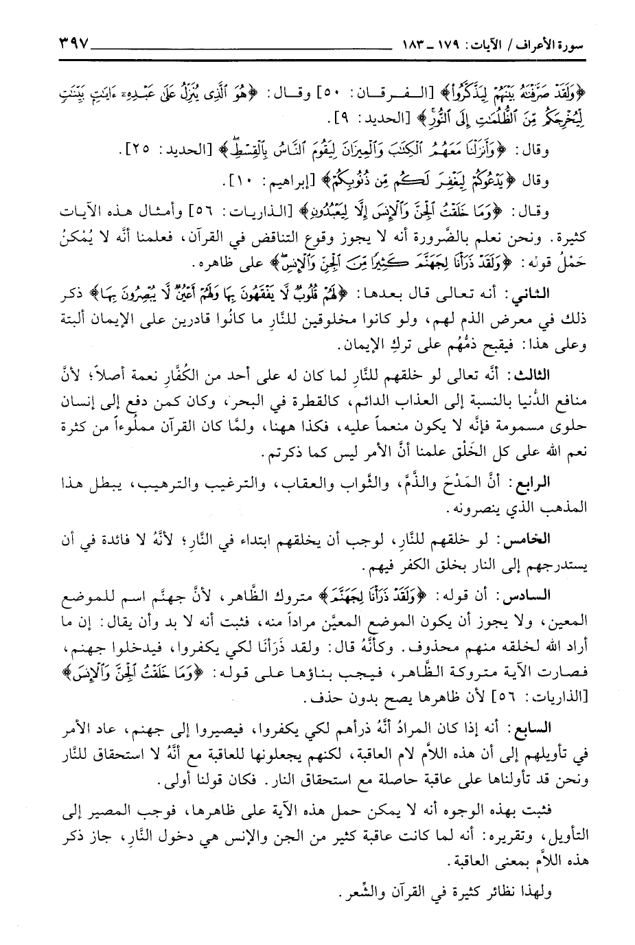 وقال: {وَمَا خَلَقْتُ الجن والإنس إِلاَّ لِيَعْبُدُونِ} [الذاريات: 56] وأمثال هذه الآيات كثيرة. ونحن نعلم بالضَّرورة أنه لا يجوز وقوع التناقض في القرآن، فعلمنا أنَّه لا يُمْكنُ حَمْلُ قوله: {وَلَقَدْ ذَرَأْنَا لِجَهَنَّمَ كَثِيراً مِّنَ الجن والإنس} على ظاهره.