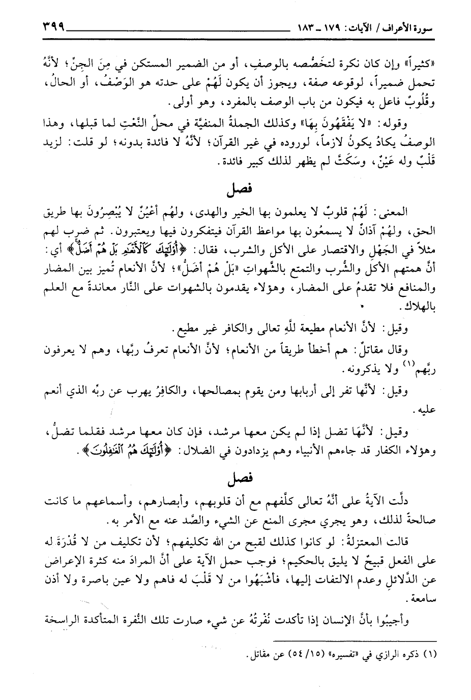 قالت المعتزلةُ: لو كانوا كذلك لقبح من الله تكليفهم؛ لأن تكليف من لا قُدْرَةَ له على الفعل قبيحٌ لا يليق بالحكيم؛ فوجب حمل الآية على أنَّ المرادَ منه كثرة الإعراض عن الدَّلائلِ وعدم الالتفات إليها، فأشْبَهُوا من لا قَلْبَ له فاهم ولا عين باصرة ولا أذن سامعة.