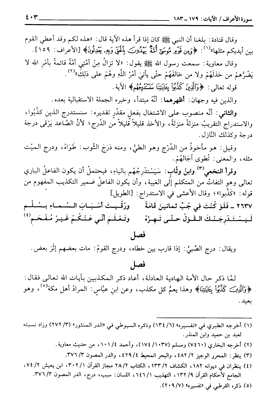 والثاني: أنه منصوب على الاشتغال بفعل مقدر تقديره: سنستدرج الذين كذبوا، والاستدراج التقريب منزلة منزلة، والأخ قليلا قليلا من الدرج؛ لأن الصاعد يرقى درجة درجة وكذلك النازل.