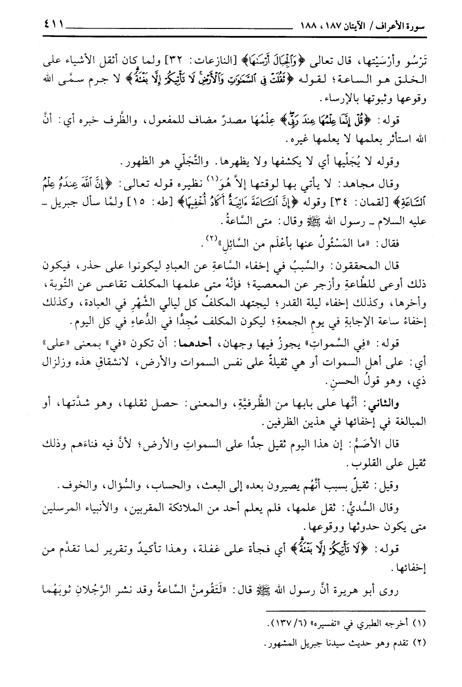 وقال مجاهد: لا يأتي بها لوقتها إلاَّ هُوَ نظيره قوله تعالى: {إِنَّ الله عِندَهُ عِلْمُ الساعة} [لقمان: 34] وقوله {إِنَّ الساعة آتِيَةٌ أَكَادُ أُخْفِيهَا} [طه: 15] ولمَّا سأل جبريل - عليه السلام - رسول الله صَلَّى اللَّهُ عَلَيْهِ وَسَلَّم َ وقال: «متى السَّاعةُ.