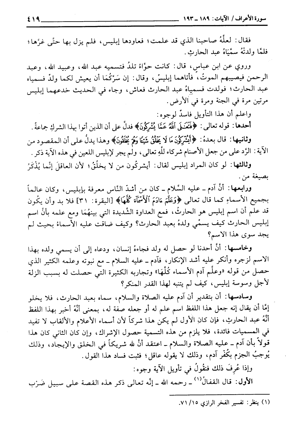 وسادسها: أن بتقدير أن آدم عَلَيْهِ الصَّلَاة وَالسَّلَام ُ، سماه بعبد الحارث، فلا يخلو إمَّا أن يقال إنه جعل هذا اللفظ اسم علم له أو جعله صفة له، بمعنى أنَّهُ أخبر بهذا اللفظ أنَّهُ عبد الحارثِ، فإن كان الأول لم يكن هذا شركاً لأن أسماء الأعلام والألقاب لا تفيد في المسميات فائدة، فلا يلزم من هذه التسمية حصول الإشراك، وإن كان الثاني كان هذا قولاً بأن آدم - عَلَيْهِ الصَّلَاة وَالسَّلَام ُ - اعتقد أنَّ لله شريكاً في الخلق والإيجاد، وذلك يُوجبُ الجزم بكُفْر آدم، وذلك لا يقوله عاقل؛ فثبت فساد هذا القول.