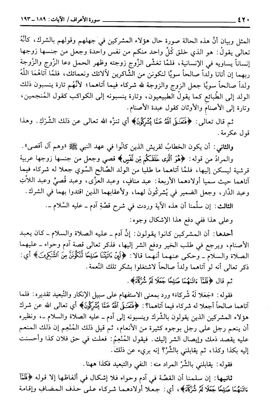 المثل وبيان أنَّ هذه الحالة صورة حال هؤلاء المشركين في جهلهم وقولهم بالشرك، كأنَّهُ تعالى يقولُ: هو الذي خلق كُلَّ واحد منكم من نفس واحدة وجعل من جنسها زوجها إنساناً يساويه في الإنسانية، فلمَّا تغشَّى الزَّوج زوجته وظهر الحمل دعا الزَّوج والزَّوجة ربهما إن أتانا ولداً صالحاً سويّاً لنكونن من الشَّاكرين لآلائك ونعمائك، فلمَّا آتاهُمَا اللَّهُ ولداً صالحاً سويّاً جعل الزوج والزوجة لله شركاء فيما آتاهما؛ لأنَّهُم تارة ينسبون ذلك الولد غلى الطَّبائعِ كما يقولُ الطبيعيون، وتارة ينسبونه إلى الكواكب كقول المُنجمين، وتارة إلى الأصنامِ والأوثان كقول عبدة الأصنام.
