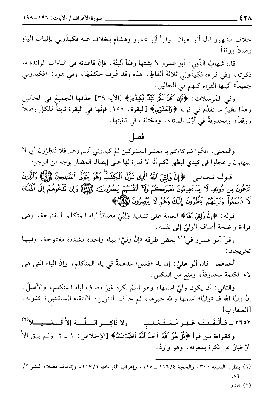 خلاف مشهور قال أبُو حيان: وقرأ أبُو عمرو وهشام بخلاف عنه فكيدُونِي بإثبات الياءِ وصلاً ووقفاً.