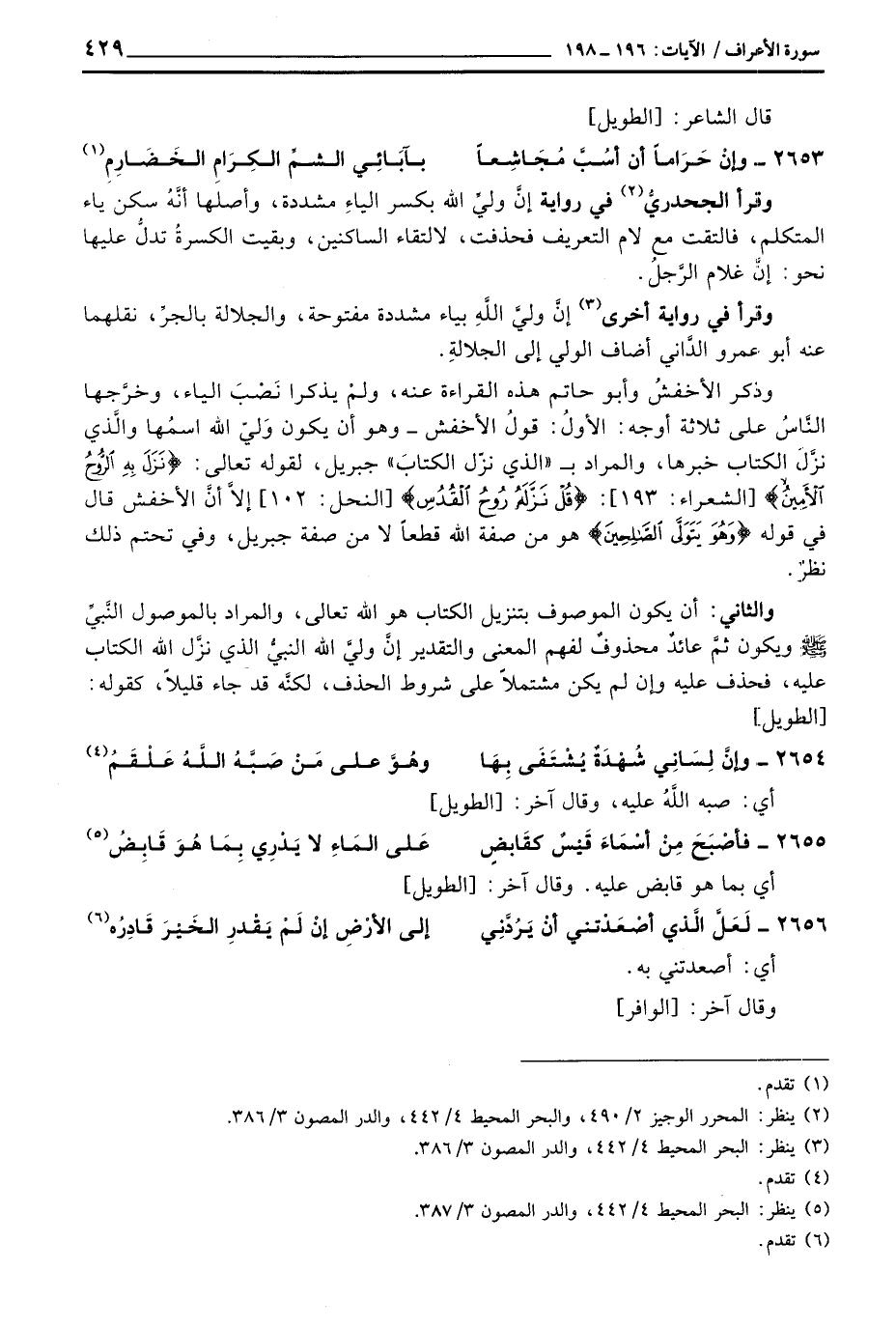 والثاني: أن يكون الموصوف بتنزيل الكتاب هو الله تعالى، والمراد بالموصول النَّبيِّ صَلَّى اللَّهُ عَلَيْهِ وَسَلَّم َ ويكون ثمَّ عائدٌ محذوفٌ لفهم المعنى والتقدير إنَّ وليَّ الله النبيُّ الذي نزَّ الله الكتاب عليه، فحذف عليه وإن لم يكن مشتملاً على شروط الحذف، لكنَّه قد جاء قليلاً، كقوله: [الطويل]