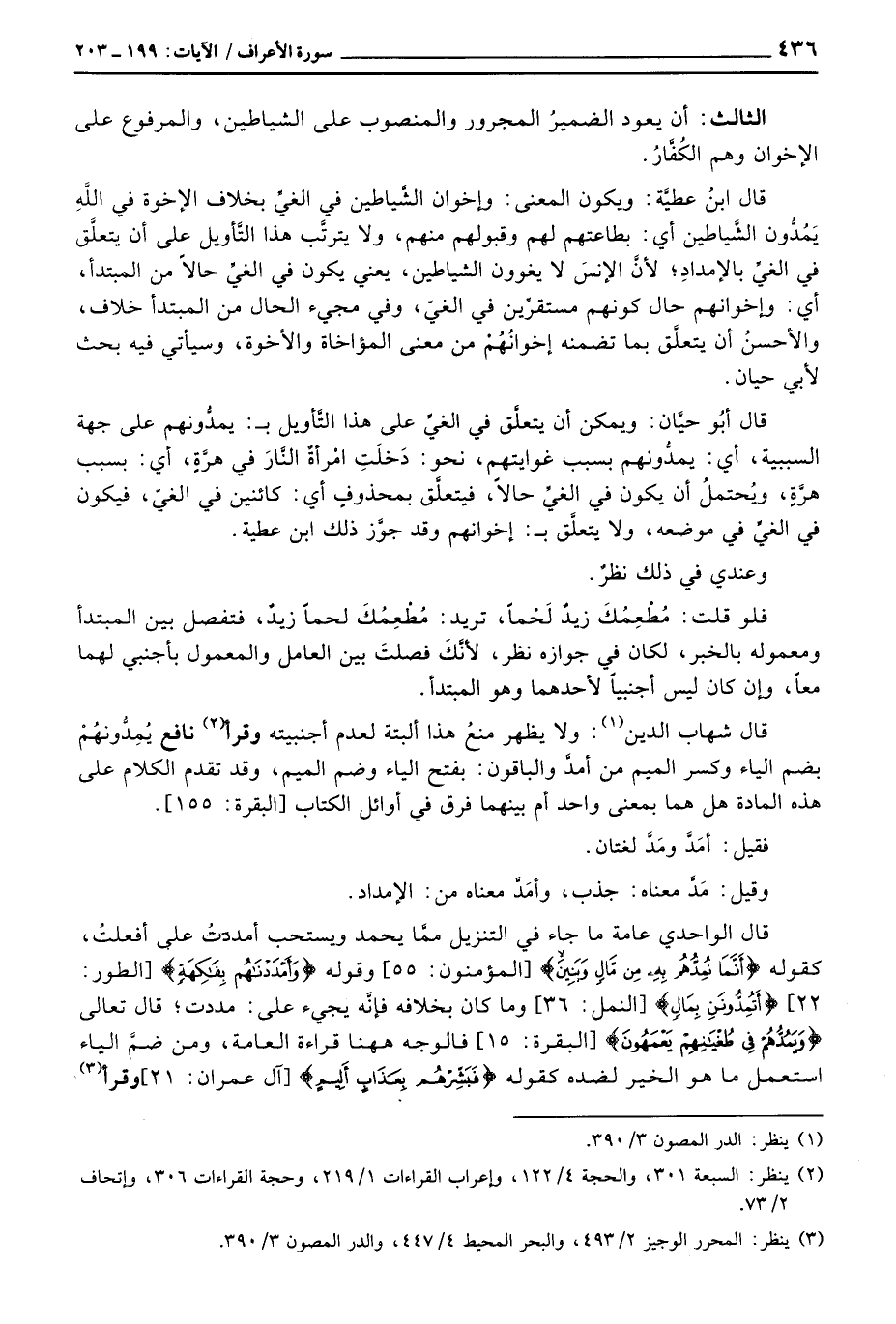 قال شهاب الدين: ولا يظهر منعُ هذا ألبتة لعدم أجنبيته وقرأ نافع يُمِدُّونهُمْ بضم الياء وكسر الميم من أمدَّ والباقون: بفتح الياء وضم الميم، وقد تقدم الكلام على هذه المادة هل هما بمعنى واحد أم بينهما فرق في أوائل الكتاب [البقرة: 155] .