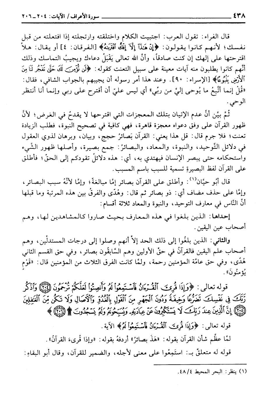والثاني: الذين بلغُوا إلى ذلك الحد إلاَّ أنهم وصلوا إلى درجات المستدلِّين، وهم أصحاب علم اليقين فالقرآنُ في حقِّ الأولين وهم السَّابقُون بصائر، وفي حق القسم الثاني هُدىً، وفي حق عامَّة المؤمنين رحمة، ولمَّا كانت الرفق الثلاث من المؤمنين قال: «قَوْمٍ يُؤمنُونَ» .
