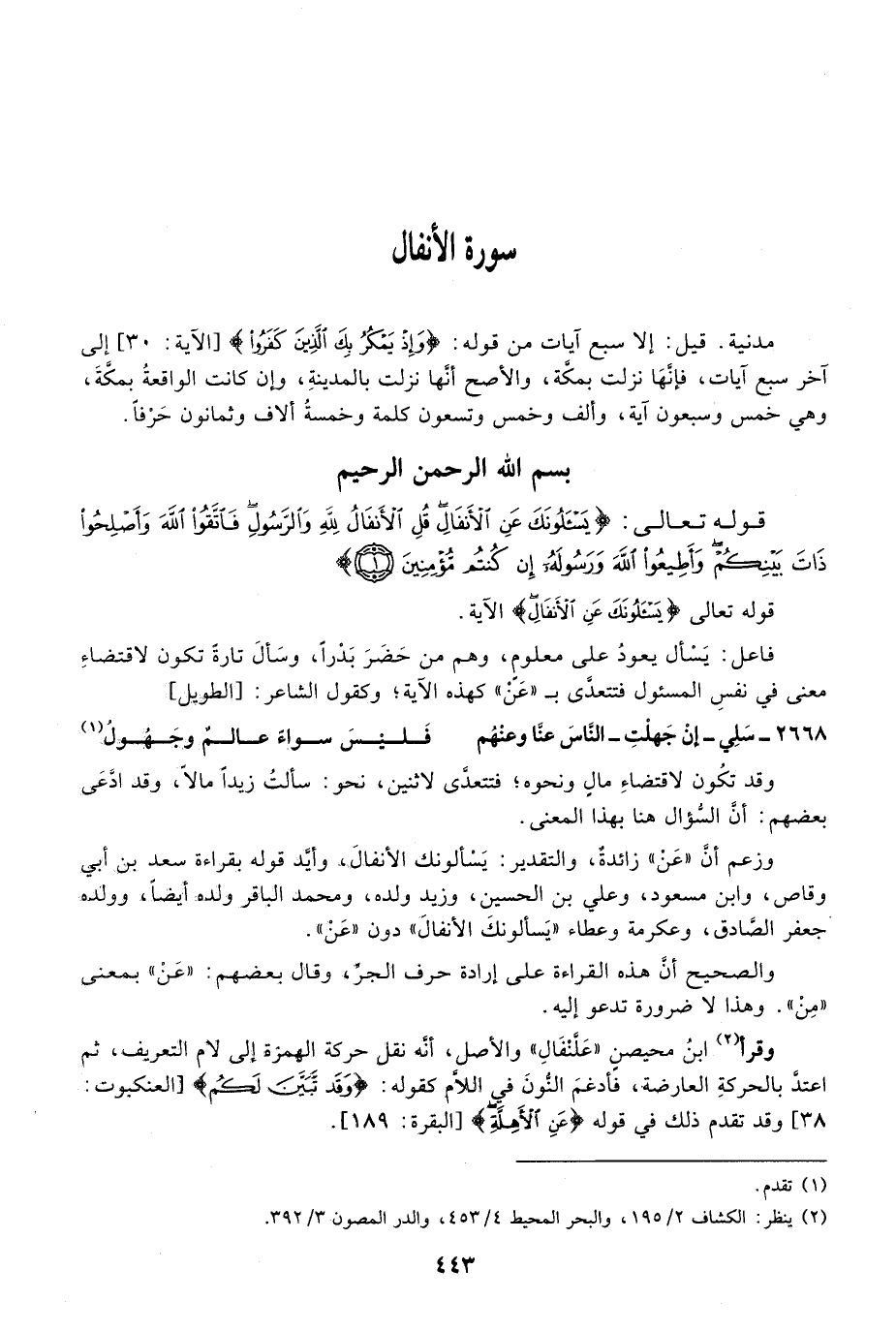 وزعم أنَّ «عَنْ» زائدةٌ، والتقدير: يَسْألونك الأنفالَ، وأيَّد قوله بقراءة سعد بن أبي وقاص، وابن مسعود، وعلي بن الحسين، وزيد ولده، ومحمد الباقر ولده أيضاً، وولده جعفر الصَّادق، وعكرمة وعطاء «يَسألونكَ الأنفالَ» دون «عَنْ» .