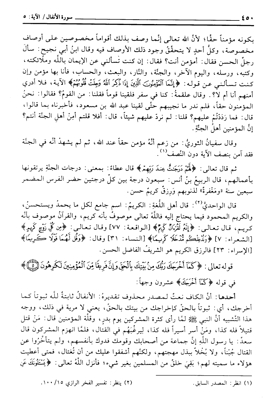 أحدها: أنَّ الكاف نعتٌ لمصدر محذوف تقديرهُ: الأنفالُ ثابتةٌ للَّه ثبوتاً كما أخرجك، أي: ثبوتاً بالحقِّ كإخراجك من بيتك بالحقِّ، يعني لا مرية في ذلك، ووجه هذ التَّشبيه أنَّ النبي صَلَّى اللَّهُ عَلَيْهِ وَسَلَّم َ لمَّا رأى كثرة المشركين يوم بدرٍ، وقلَّة المؤمنين قال: مَنْ قتل قتيلاً فله كذا، ومَنْ أسر أسيراً فله كذا، لِيرغِّبَهُم في القتال، فلمَّا انهزم المشركون قال سعدٌ: يا رسول اللَّهِ إنَّ جماعة من أصحابك وقومك فدوك بأنفسهم، ولم يتأخَّرُوا عن القتال جُبْناً، ولا بُخْلاً ببذل مهجتهم، ولكنَّهم أشفقوا عليك من أن تُغتال، فمتى أعطيت هؤلاء ما سميته لهم؛ بَقِيَ خلقٌ من المسلمين بغير شيء؛ فأنزل اللَّهُ تعالى: {يَسْأَلُونَكَ عَنِ