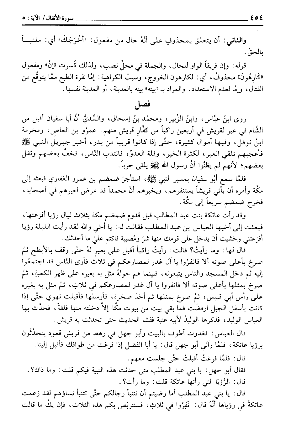 قال: يا بني عبد المطلب أما رضيتم أن تتنبأ رجالكم حتَّى تتنبأ نساؤهم لقد زعمت عاتكةُ في رؤياها أنَّهُ قال: انْفِرُوا في ثلاثٍ، فسنتربّص بكم هذه الثلاث، فإن يكُ ما قالت