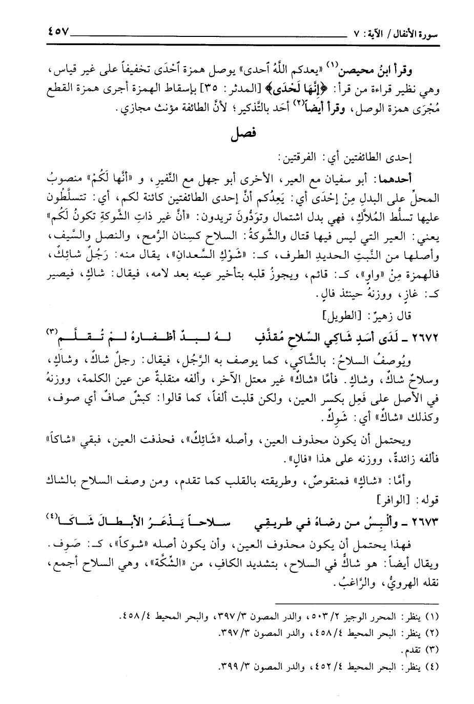 أحدهما: أبو سفيان مع العير، الأخرى أبو جهل مع النَّفيرِ، و «أنَّها لَكُمْ» منصوبُ المحلِّ على البدلِ مِنْ إحْدَى أي: يَعِدُكم أنَّ إحدى الطائفتين كائنة لكم، أي: تتسلَّطُون عليها تسلُّط المُلاَّكِ، فهي بدل اشتمال وتوَدُّونَ تريدون: {وَتَوَدُّونَ أَنَّ غَيْرَ ذَاتِ الشوكة تَكُونُ لَكُمْ} يعني: العير التي ليس فيها قتال والشَّوكةُ: السلاح كسِنان الرُّمح، والنصل والسَّيف، وأصلها من النَّبتِ الحديدِ الطرف، ك: «شَوْكِ السَّعدان» ، يقال منه: رَجُلٌ شائِكٌ، فالهمزة مِنْ «واوٍ» ، ك: قائم، ويجوزُ قلبه بتأخير عينه بعد لامه، فيقال: شاكٍ، فيصير ك: غازٍ، ووزنهُ حينئذ فالٍ.