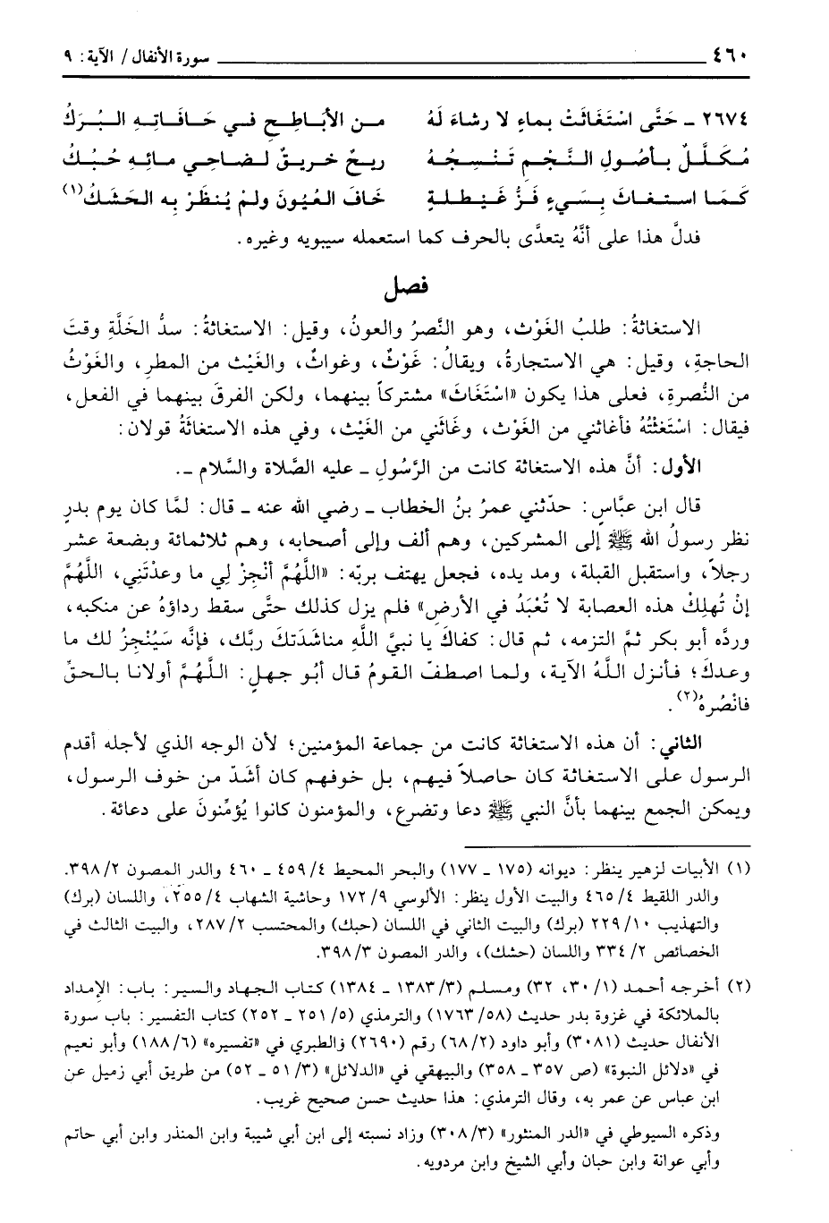 الثاني: أن هذه الاستغاثة كانت من جماعة المؤمنين؛ لأن الوجه الذي لأجله أقدم الرسول على الاستغاثة كان حاصلاً فيهم، بل خوفهم كان أشَدّ من خوف الرسول، ويمكن الجمع بينهما بأنَّ النبي صَلَّى اللَّهُ عَلَيْهِ وَسَلَّم َ دعا وتضرع، والمؤمنون كانوا يُؤمِّنونَ على دعائه.