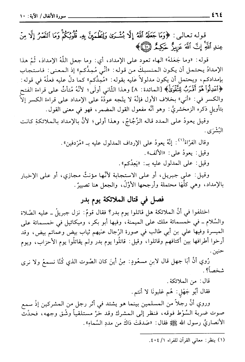 قوله: «وما جَعَلَهُ» الهاء تعود على الإمداد، أي: وما جعل اللَّهُ الإمدادَ، ثُمَّ هذا الإمدادُ يحتمل أن يكون المنسبكَ من قوله: «إنِّي مُمِدُّك» إذ المعنى: فاستجاب بإمدادكم، ويحتمل أن يكون مدلولاً عليه بقوله: «مُمِدُّكم» كما دلَّ عليه فعلُهُ في قوله: {اعدلوا هُوَ أَقْرَبُ للتقوى} [المائدة: 8] وهذا الثَّاني أولَى؛ لأنَّه مُتأتٍّ على قراءة الفتح والكسر في: «إني» بخلاف الأول فإنَّهُ لا يتّجه عودُهُ على الإمداد على قراءة الكسر إلاَّ بتأويلٍ ذكره الزمخشريُّ: وهو أنَّه مفعول القول المضمر، فهو في معنى القول.