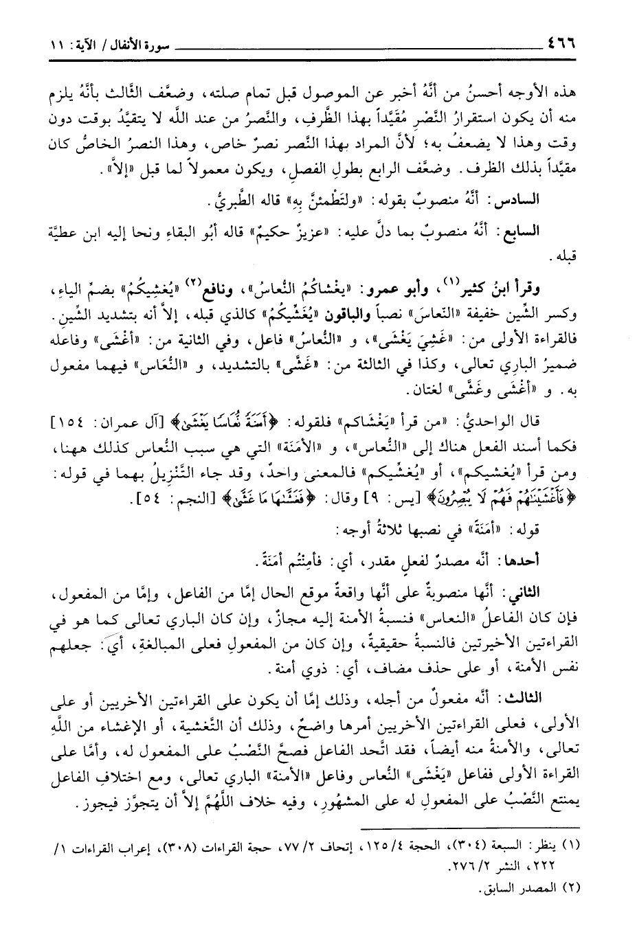 الثاني: أنَّها منصوبةٌ على أنَّها واقعةٌ موقع الحال إمَّا من الفاعل، وإمَّا من المفعول، فإن كان الفاعل ُ «النعاس» فنسبةُ الأمنة إليه مجازٌ، وإن كان الباري تعالى كما هو في القراءتين الأخيرتين فالنسبةُ حقيقيةٌ، وإن كان من المفعولِ فعلى المبالغةِ، أي: جعلهم نفس الأمنة، أو على حذف مضاف، أي: ذوي أمنة.