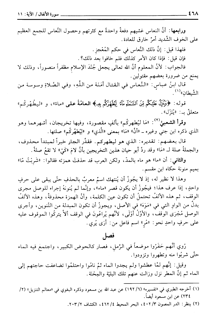 والثاني: أن «ما» هو ماء بالمدّ، ولكن العرب قد حذفتْ همزته فقالوا: «شَرِبْتُ مًا» بميم منونة حكاه ابن مقسم.