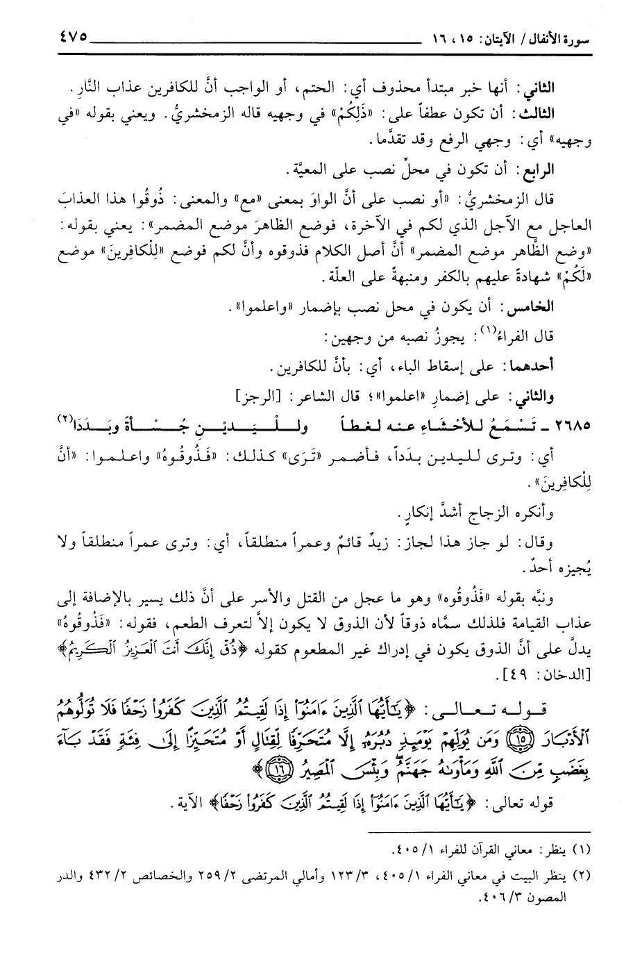 والثانيك على إضمارِ «اعلموا» ؛ قال الشاعر: [الرجز]