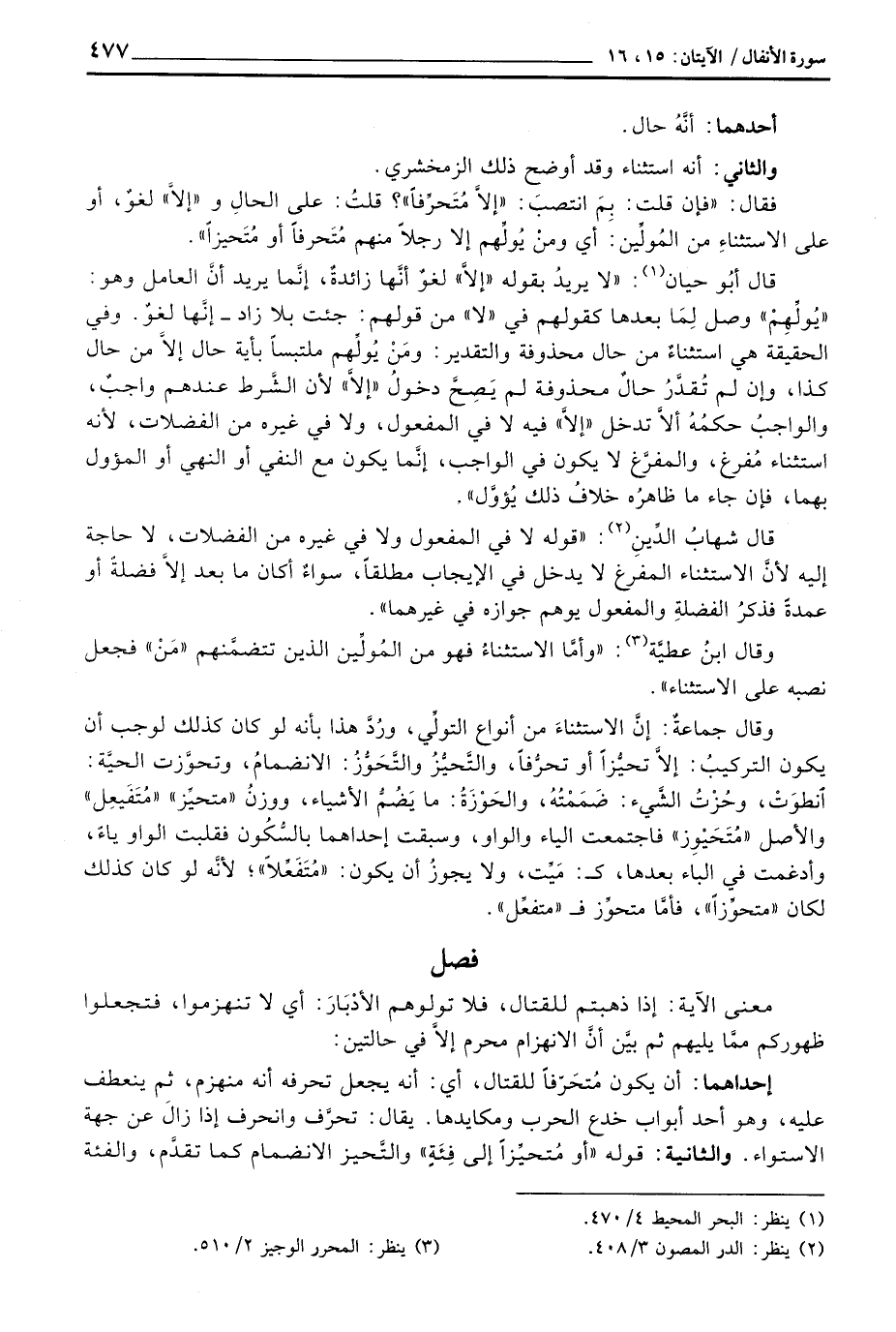 إحداهما: أن يكون مُتحَرّفاً للقتال، أي: أنه يجعل تحرفه أنه منهزم، ثم ينعطف عليه، وهو أحد أبواب خدع الحرب ومكايدها. يقال: تحرَّف وانحرف إذا زالَ عن وجهة الاستواء. والثانية: قوله {أَوْ مُتَحَيِّزاً إلى فِئَةٍ} والتَّحيز الانضمام كما تقدَّم، والفئة
