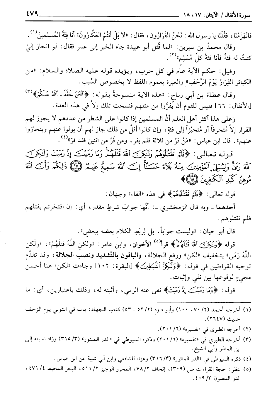 وعلى هذا أكثر أهل العلم أنَّ المسلمين إذا كانوا على الشطر من عددهم لا يجوز لهم الفرار غلاَّ مُتحرفاً أو مُتحيِّزاً إلى فئةٍ، وإن كانوا أقلَّ من ذلك جاز لهم أن يولوا عنهم وينحازوا عنهم» . قال ابن عباس: «مَنْ فرَّ من ثلاثة فلم يفر، ومن فَرَّ من اثنين فقد فرّ» .