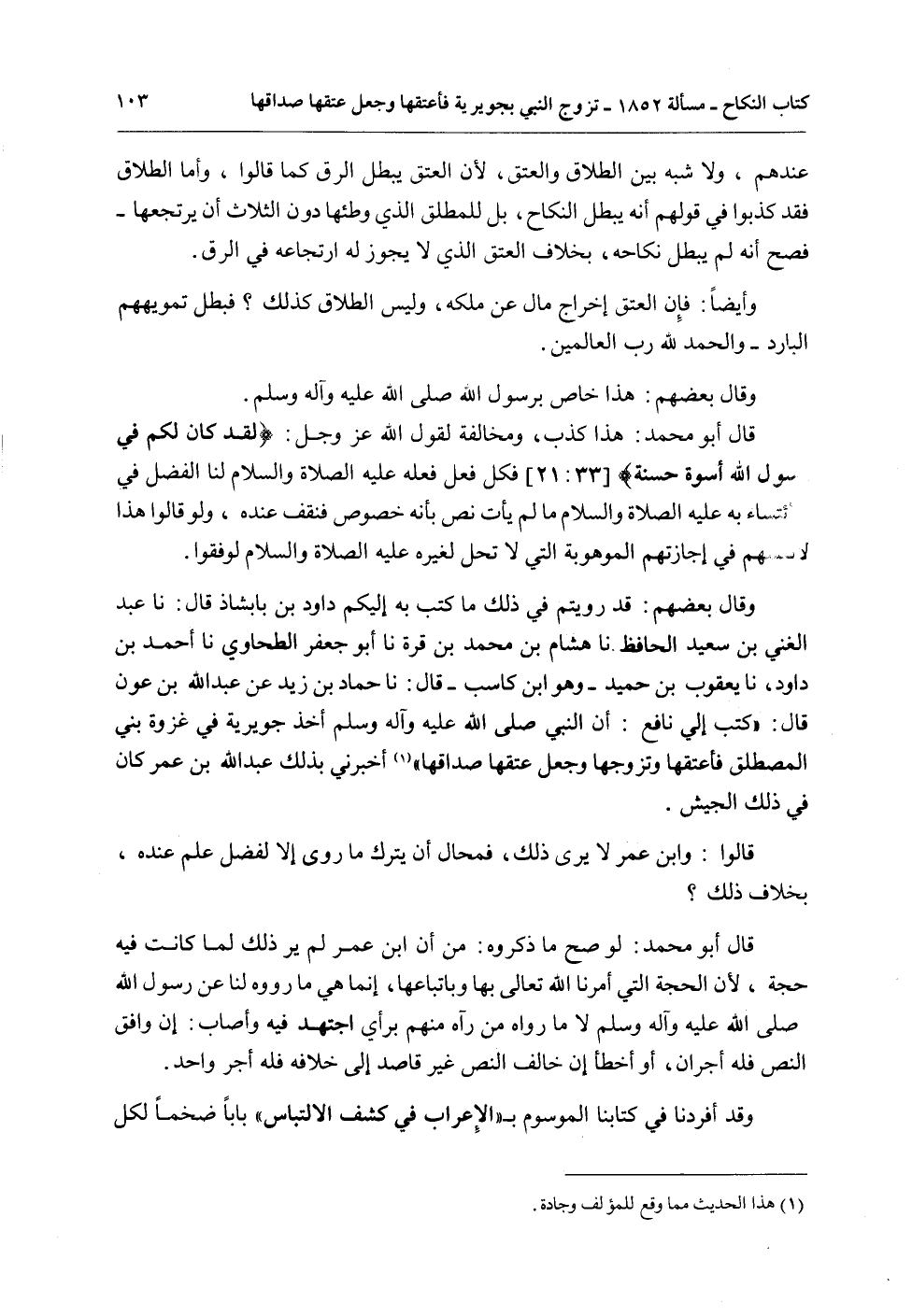 وَقَالَ بَعْضُهُمْ: قَدْ رَوَيْتُمْ فِي ذَلِكَ مَا كَتَبَ بِهِ إلَيْكُمْ دَاوُد بْنُ بَابْشَاذَ قَالَ: نا عَبْدُ الْغَنِيِّ بْنُ سَعِيدٍ الْحَافِظُ نا هِشَامُ بْنُ مُحَمَّدِ بْنِ قُرَّةَ نا أَبُو جَعْفَرٍ الطَّحَاوِيَّ نا أَحْمَدُ بْنُ دَاوُد، نا يَعْقُوبُ بْنُ حُمَيْدٍ - وَهُوَ ابْنُ كَاسِبٍ - قَالَ: نَا حَمَّادُ بْنُ زَيْدٍ عَنْ عَبْدِ اللَّهِ بْنِ عَوْنٍ قَالَ: كَتَبَ إلَيَّ نَافِعٌ: «أَنَّ النَّبِيَّ - صَلَّى اللَّهُ عَلَيْهِ وَآلِهِ وَسَلَّمَ - أَخَذَ جُوَيْرِيَةَ فِي غَزْوَةِ بَنِي الْمُصْطَلِقِ فَأَعْتَقَهَا وَتَزَوَّجَهَا وَجَعَلَ عِتْقَهَا صَدَاقَهَا أَخْبَرَنِي بِذَلِكَ عَبْدُ اللَّهِ بْنُ عُمَرَ كَانَ فِي ذَلِكَ الْجَيْشِ»
