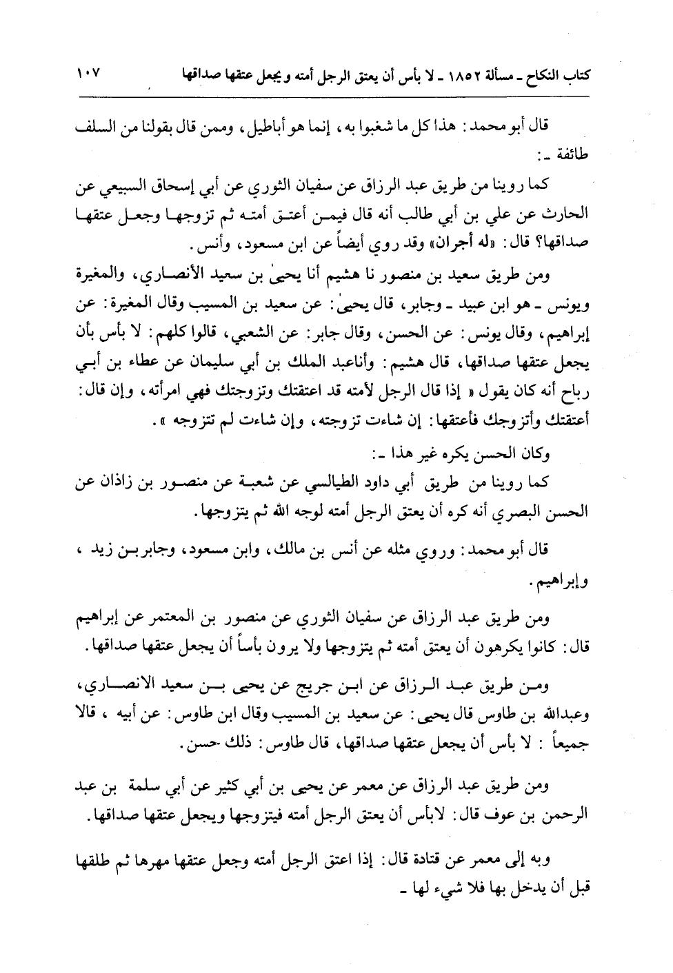 وَمِنْ طَرِيقِ عَبْدِ الرَّزَّاقِ عَنْ سُفْيَانَ الثَّوْرِيِّ عَنْ مَنْصُورِ بْنِ الْمُعْتَمِرِ عَنْ إبْرَاهِيمَ قَالَ: كَانُوا يَكْرَهُونَ أَنْ يُعْتِقَ أَمَتَهُ ثُمَّ يَتَزَوَّجُهَا وَلَا يَرَوْنَ بَأْسًا أَنْ يَجْعَلَ عِتْقَهَا صَدَاقَهَا. وَمِنْ طَرِيقِ عَبْدِ الرَّزَّاقِ عَنْ ابْنِ جُرَيْجٍ عَنْ يَحْيَى بْنِ سَعِيدٍ الْأَنْصَارِيِّ، وَعَبْدِ اللَّهِ بْنِ طَاوُسٍ قَالَ يَحْيَى: عَنْ سَعِيدِ بْنِ الْمُسَيِّبِ وَقَالَ ابْنُ طَاوُسٍ: عَنْ أَبِيهِ، قَالَا جَمِيعًا: لَا بَأْسَ أَنْ يَجْعَلَ عِتْقَهَا صَدَاقَهَا، قَالَ طَاوُسٍ: ذَلِكَ حَسَنٌ.
