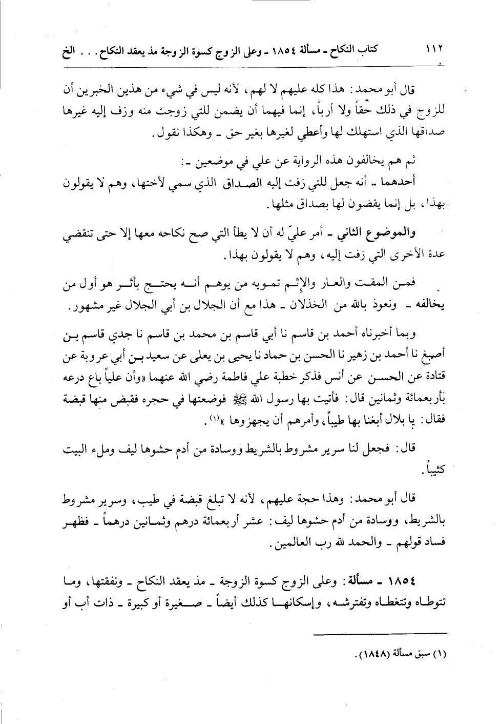 وَبِمَا أَخْبَرَنَاهُ أَحْمَدُ بْنُ قَاسِمٍ نا أَبِي قَاسِمُ بْنُ مُحَمَّدِ بْنِ قَاسِمٍ نا جَدِّي قَاسِمُ بْنُ أَصْبَغَ نا أَحْمَدُ بْنُ زُهَيْرٍ نا الْحَسَنُ بْنُ حَمَّادٍ نَا يَحْيَى بْنُ يَعْلَى عَنْ سَعِيدِ بْنِ أَبِي عَرُوبَةَ عَنْ قَتَادَةَ عَنْ الْحَسَنِ عَنْ أَنَسٍ فَذَكَرَ خِطْبَةَ عَلِيٍّ فَاطِمَةَ - رَضِيَ اللَّهُ عَنْهُمَا - «وَأَنَّ عَلِيًّا بَاعَ دِرْعَهُ بِأَرْبَعِمِائَةٍ وَثَمَانِينَ قَالَ: فَأَتَيْتُ بِهَا رَسُولَ اللَّهِ - صَلَّى اللَّهُ عَلَيْهِ وَسَلَّمَ - فَوَضَعْتُهَا فِي حِجْرِهِ فَقَبَضَ مِنْهَا قَبْضَةً فَقَالَ: يَا بِلَالٌ أَبْغِنَا بِهَا طِيبًا، وَأَمَرَهُمْ أَنْ يُجَهِّزُوهَا» قَالَ: فَجُعِلَ لَنَا سَرِيرٌ مَشْرُوطٌ بِالشَّرْطِ وَوِسَادَةٌ مِنْ أُدْمٍ حَشْوُهَا لِيفٌ وَمِلْءُ الْبَيْتِ كَثِيبًا.