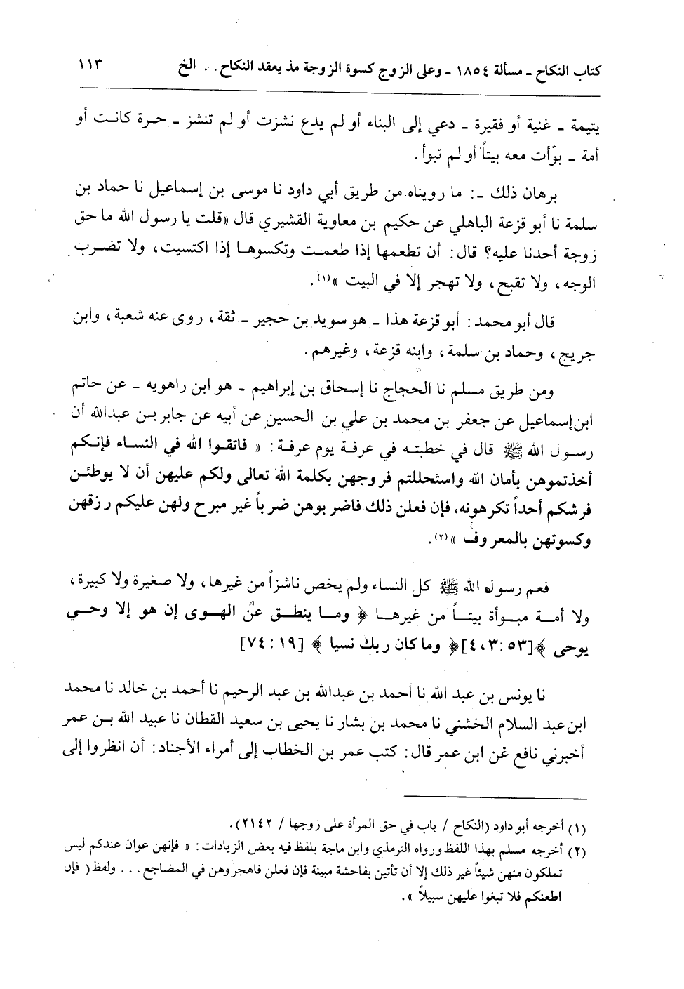 بُرْهَانُ ذَلِكَ -: مَا رُوِّينَاهُ مِنْ طَرِيقِ أَبِي دَاوُد نا مُوسَى بْنُ إسْمَاعِيلَ نا حَمَّادُ بْنُ سَلَمَةَ نا أَبُو قَزَعَةَ الْبَاهِلِيُّ " عَنْ حَكِيمِ بْنِ مُعَاوِيَةَ الْقُشَيْرِيِّ قَالَ «قُلْتُ: يَا رَسُولَ اللَّهِ مَا حَقُّ زَوْجَةِ أَحَدِنَا عَلَيْهِ؟ قَالَ: أَنْ تُطْعِمَهَا إذَا طَعِمْتُ وَتَكْسُوَهَا إذَا اكْتَسَيْتُ، وَلَا تَضْرِبْ الْوَجْهَ، وَلَا تُقَبِّحْ، وَلَا تَهْجُرْ إلَّا فِي الْبَيْتِ» .