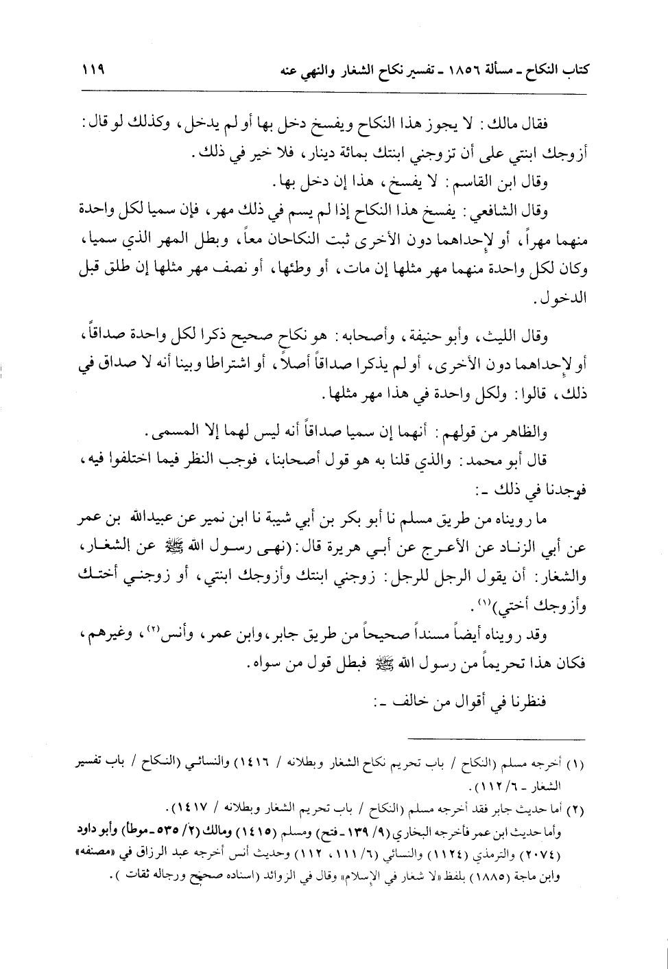 قَالَ أَبُو مُحَمَّدٍ: وَاَلَّذِي قُلْنَا بِهِ هُوَ قَوْلُ أَصْحَابِنَا، فَوَجَبَ النَّظَرُ فِيمَا اخْتَلَفُوا فِيهِ، فَوَجَدْنَا فِي ذَلِكَ -: مَا رُوِّينَاهُ مِنْ طَرِيقِ مُسْلِمٍ نا أَبُو بَكْرِ بْنُ أَبِي شَيْبَةَ نا ابْنُ نُمَيْرٍ عَنْ عُبَيْدِ اللَّهِ بْنِ عُمَرَ عَنْ أَبِي الزِّنَادِ عَنْ الْأَعْرَجِ عَنْ أَبِي هُرَيْرَةَ قَالَ: «نَهَى رَسُولُ اللَّهِ - صَلَّى اللَّهُ عَلَيْهِ وَسَلَّمَ - عَنْ الشِّغَارِ، وَالشِّغَارُ: أَنْ يَقُولَ الرَّجُلُ لِلرَّجُلِ: زَوِّجْنِي ابْنَتَكَ وَأُزَوِّجُكَ ابْنَتِي، أَوْ زَوِّجْنِي أُخْتَكَ وَأُزَوِّجُكَ أُخْتِي»
