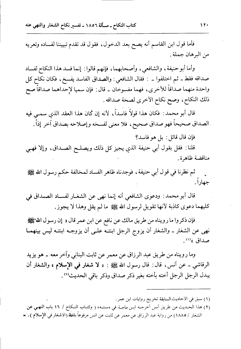 فَإِنْ ذَكَرُوا مَا رُوِّينَاهُ مِنْ طَرِيقِ مَالِكٍ عَنْ نَافِعٍ عَنْ ابْنِ عُمَرَ قَالَ «إنَّ رَسُولَ اللَّهِ - صَلَّى اللَّهُ عَلَيْهِ وَسَلَّمَ - نَهَى عَنْ الشِّغَارِ - وَالشِّغَارُ أَنْ يُزَوِّجَ الرَّجُلُ ابْنَتَهُ عَلَى أَنْ يُزَوِّجَهُ ابْنَتَهُ لَيْسَ بَيْنَهُمَا صَدَاقٌ» .