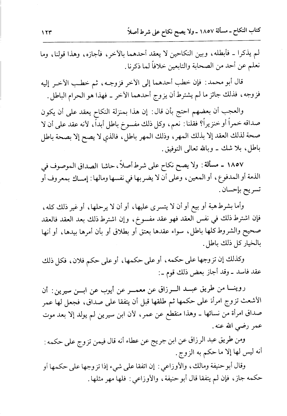 1857 - مَسْأَلَةٌ: وَلَا يَصِحُّ نِكَاحٌ عَلَى شَرْطٍ أَصْلًا، حَاشَا الصَّدَاقَ الْمَوْصُوفَ فِي الذِّمَّةِ أَوْ الْمَدْفُوعَ، أَوْ الْمُعَيَّنَ، وَعَلَى أَنْ لَا يَضُرَّ بِهَا فِي نَفْسِهَا وَمَالِهَا: إمْسَاكٌ بِمَعْرُوفٍ أَوْ تَسْرِيحٌ بِإِحْسَانٍ.