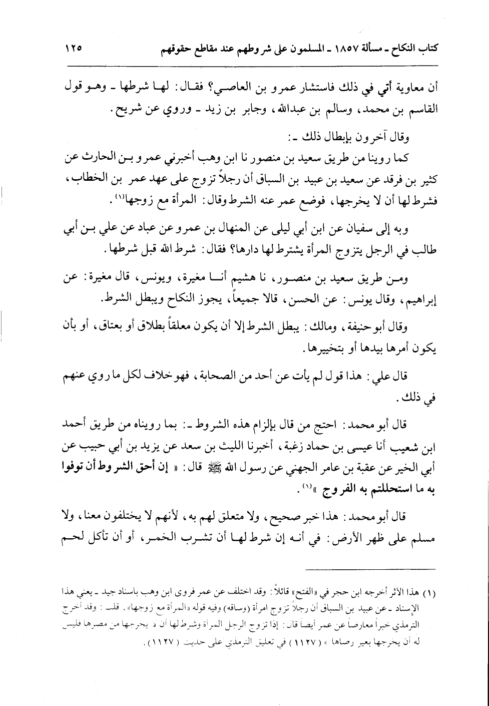 قَالَ أَبُو مُحَمَّدٍ: احْتَجَّ مَنْ قَالَ بِإِلْزَامِ هَذِهِ الشُّرُوطِ -: بِمَا رُوِّينَاهُ مِنْ طَرِيقِ أَحْمَدَ بْنِ شُعَيْبٍ نا عِيسَى بْنُ حَمَّادٍ زُغْبَةُ، أَخْبَرَنَا اللَّيْثُ بْنُ سَعْدٍ عَنْ يَزِيدَ بْنِ أَبِي حَبِيبٍ عَنْ أَبِي الْخَيْرِ عَنْ عُقْبَةَ بْنِ عَامِرٍ الْجُهَنِيِّ عَنْ رَسُولِ اللَّهِ - صَلَّى اللَّهُ عَلَيْهِ وَسَلَّمَ - قَالَ: «إنَّ أَحَقَّ الشُّرُوطِ أَنْ تُوفُوا بِهِ مَا اسْتَحْلَلْتُمْ بِهِ الْفُرُوجَ» .