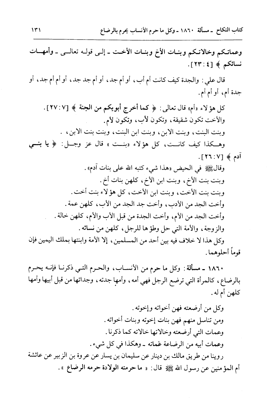 1860 - مَسْأَلَةٌ: وَكُلُّ مَا حَرُمَ مِنْ الْأَنْسَابِ، وَالْحُرُمُ الَّتِي ذَكَرْنَا فَإِنَّهُ يَحْرُمُ بِالرَّضَاعِ، كَالْمَرْأَةِ الَّتِي تُرْضِعُ الرَّجُلَ فَهِيَ أُمُّهُ، وَأُمُّهَا جَدَّتُهُ، وَجَدَّاتُهَا مِنْ قِبَلِ أَبِيهَا وَأُمِّهَا كُلُّهُنَّ أُمٌّ لَهُ.