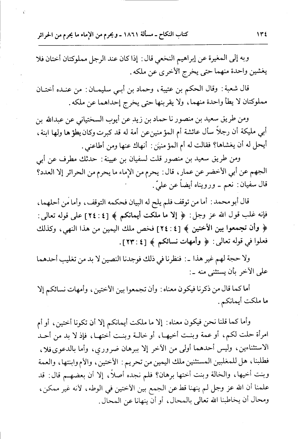 وَأَمَّا كَمَا قُلْنَا نَحْنُ فَيَكُونُ مَعْنَاهُ: إلَّا مَا مَلَكَتْ أَيْمَانُكُمْ إلَّا أَنْ تَكُونَا أُخْتَيْنِ، أَوْ أُمَّ امْرَأَةٍ حَلَّتْ لَكُمْ، أَوْ عَمَّةً وَبِنْتَ أَخِيهَا، أَوْ خَالَةً وَبِنْتَ أُخْتِهَا، فَإِذْ لَا بُدَّ مِنْ أَحَدِ الِاسْتِثْنَاءَيْنِ، وَلَيْسَ أَحَدُهُمَا أَوْلَى مِنْ الْآخَرِ إلَّا بِبُرْهَانٍ ضَرُورِيٍّ، وَأَمَّا بِالدَّعْوَى فَلَا، فَطَلَبُنَا، هَلْ لِلْمُغَلِّبِينَ الْمُسْتَثْنِينَ مِلْكَ الْيَمِينِ مِنْ تَحْرِيمِ: الْأُخْتَيْنِ، وَالْأُمِّ وَابْنَتِهَا، وَالْعَمَّةِ وَبِنْتِ أَخِيهَا، وَالْخَالَةِ وَبِنْتِ أُخْتِهَا بُرْهَانٌ؟ فَلَمْ نَجِدْهُ أَصْلًا، إلَّا أَنَّ بَعْضَهُمْ قَالَ: قَدْ عَلِمْنَا أَنَّ اللَّهَ عَزَّ وَجَلَّ لَمْ يَنْهَنَا قَطُّ عَنْ الْجَمْعِ بَيْنَ الْأُخْتَيْنِ فِي الْوَطْءِ؛ لِأَنَّهُ غَيْرُ مُمْكِنٍ، وَمُحَالٌ أَنْ يُخَاطِبَنَا اللَّهُ تَعَالَى بِالْمُحَالِ، أَوْ أَنْ يَنْهَانَا عَنْ الْمُحَالِ.