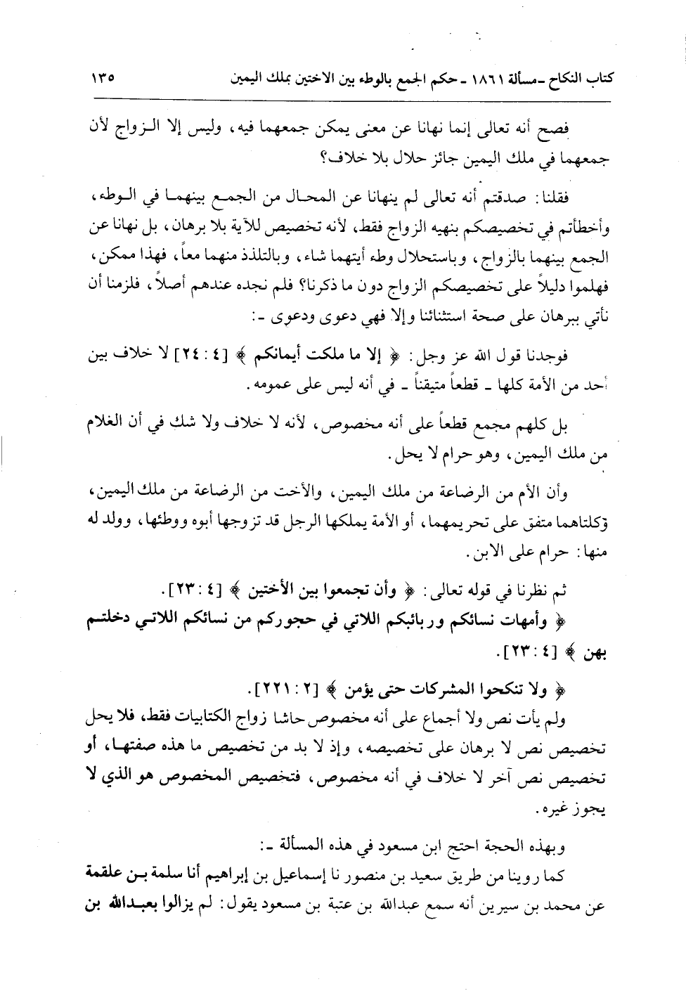 فَقُلْنَا: صَدَقْتُمْ أَنَّهُ تَعَالَى يَنْهَانَا عَنْ الْمُحَالِ مِنْ الْجَمْعِ بَيْنَهُمَا فِي الْوَطْءِ، وَأَخْطَأْتُمْ فِي تَخْصِيصِكُمْ بِنَهْيِهِ الزَّوَاجَ فَقَطْ، لِأَنَّهُ تَخْصِيصٌ لِلْآيَةِ بِلَا بُرْهَانٍ، بَلْ نَهَانَا عَنْ الْجَمْعِ بَيْنَهُمَا بِالزَّوَاجِ، وَبِاسْتِحْلَالِ وَطْءِ أَيَّتِهِمَا شَاءَ، وَبِالتَّلَذُّذِ مِنْهُمَا مَعًا، فَهَذَا مُمْكِنٌ، فَهَلُمُّوا دَلِيلًا عَلَى تَخْصِيصِكُمْ الزَّوَاجَ دُونَ مَا ذَكَرْنَا؟ فَلَمْ نَجِدْهُ عِنْدَهُمْ أَصْلًا، فَلَزِمْنَا أَنْ نَأْتِيَ بِبُرْهَانٍ عَلَى صِحَّةِ اسْتِثْنَائِنَا وَإِلَّا فَهِيَ دَعْوَى وَدَعْوَى -: فَوَجَدْنَا قَوْلَ اللَّهِ عَزَّ وَجَلَّ: {إِلا مَا مَلَكَتْ أَيْمَانُكُمْ} [النساء: 24] لَا خِلَافَ بَيْنَ أَحَدٍ مِنْ الْأُمَّةِ كُلِّهَا - قَطْعًا مُتَيَقَّنًا فِي أَنَّهُ لَيْسَ عَلَى عُمُومِهِ.