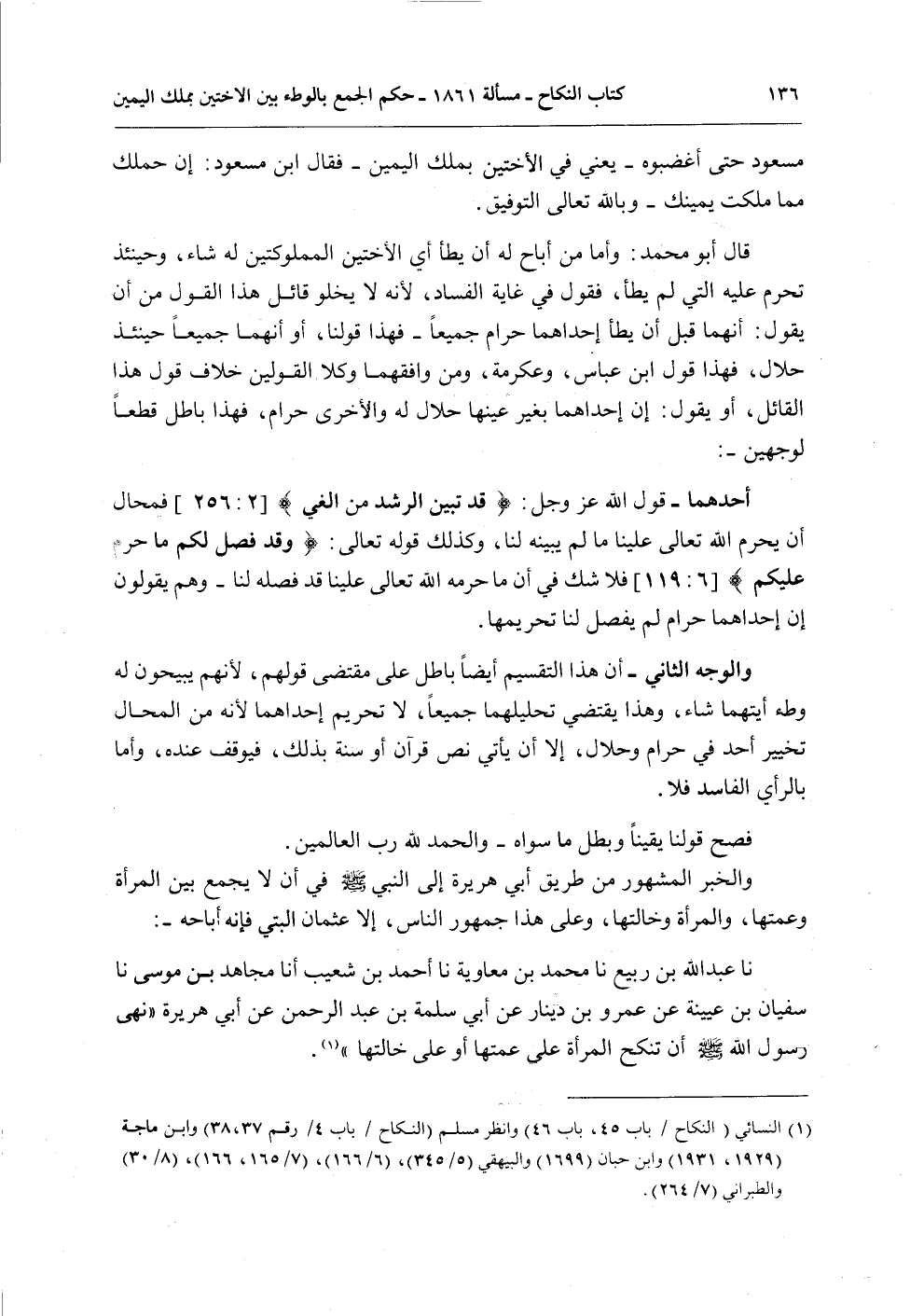 وَالْخَبَرُ الْمَشْهُورُ مِنْ طَرِيقِ أَبِي هُرَيْرَةَ إلَى النَّبِيِّ - صَلَّى اللَّهُ عَلَيْهِ وَسَلَّمَ - فِي أَنْ «لَا يَجْمَعَ بَيْنَ الْمَرْأَةِ وَعَمَّتِهَا، وَالْمَرْأَةِ وَخَالَتِهَا» ، وَعَلَى هَذَا جُمْهُورُ النَّاسِ، إلَّا عُثْمَانُ الْبَتِّيُّ فَإِنَّهُ أَبَاحَهُ -: نا عَبْدُ اللَّهِ بْنُ رَبِيعٍ نا مُحَمَّدُ بْنُ مُعَاوِيَةَ نا أَحْمَدُ بْنُ شُعَيْبٍ نا مُجَاهِدُ بْنُ مُوسَى نا سُفْيَانُ بْنُ عُيَيْنَةَ عَنْ عَمْرِو بْنِ دِينَارٍ عَنْ أَبِي سَلَمَةَ بْنِ عَبْدِ الرَّحْمَنِ عَنْ أَبِي هُرَيْرَةَ «نَهَى رَسُولُ اللَّهِ - صَلَّى اللَّهُ عَلَيْهِ وَسَلَّمَ - أَنْ تُنْكَحَ الْمَرْأَةُ عَلَى عَمَّتِهَا أَوْ عَلَى خَالَتِهَا» .