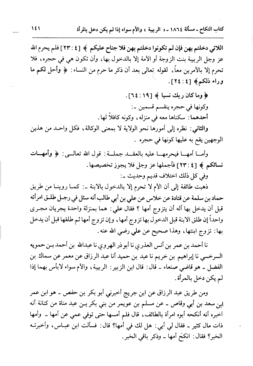 نا أَحْمَدُ بْنُ عُمَرَ بْنِ أَنَسٍ الْعُذُرِيُّ نا أَبُو ذَرٍّ الْهَرَوِيُّ نا عَبْدُ اللَّهِ بْنُ أَحْمَدَ بْنِ حَمَوَيْهِ السَّرَخْسِيُّ نا إبْرَاهِيمُ بْنُ خُرَيْمٍ نا عَبْدُ بْنُ حُمَيْدٍ نا عَبْدُ الرَّزَّاقِ نا مَعْمَرٌ عَنْ سِمَاكِ بْنِ الْفَضْلِ - هُوَ قَاضِي صَنْعَاءَ - قَالَ: قَالَ ابْنُ الزُّبَيْرِ: الرَّبِيبَةُ، وَالْأُمُّ سَوَاءٌ لَا بَأْسَ بِهِمَا إذَا لَمْ يَكُنْ دَخَلَ بِالْمَرْأَةِ.