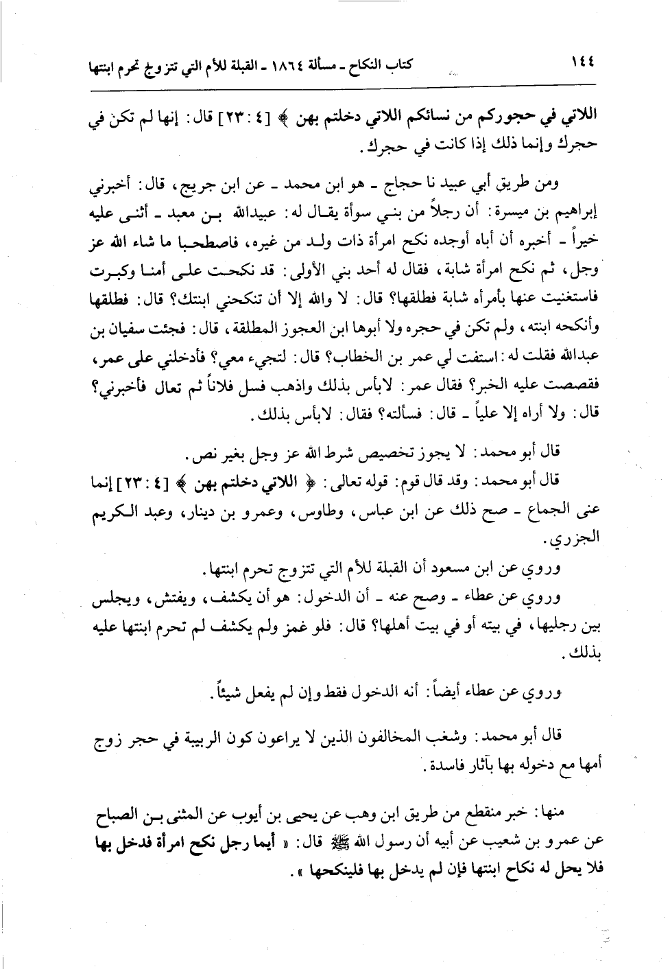 قَالَ أَبُو مُحَمَّدٍ: وَشَغَبَ الْمُخَالِفُونَ الَّذِينَ لَا يُرَاعُونَ كَوْنَ الرَّبِيبَةِ فِي حِجْرِ زَوْجِ أُمِّهَا مَعَ دُخُولٍ بِهَا بِآثَارٍ فَاسِدَةٍ.