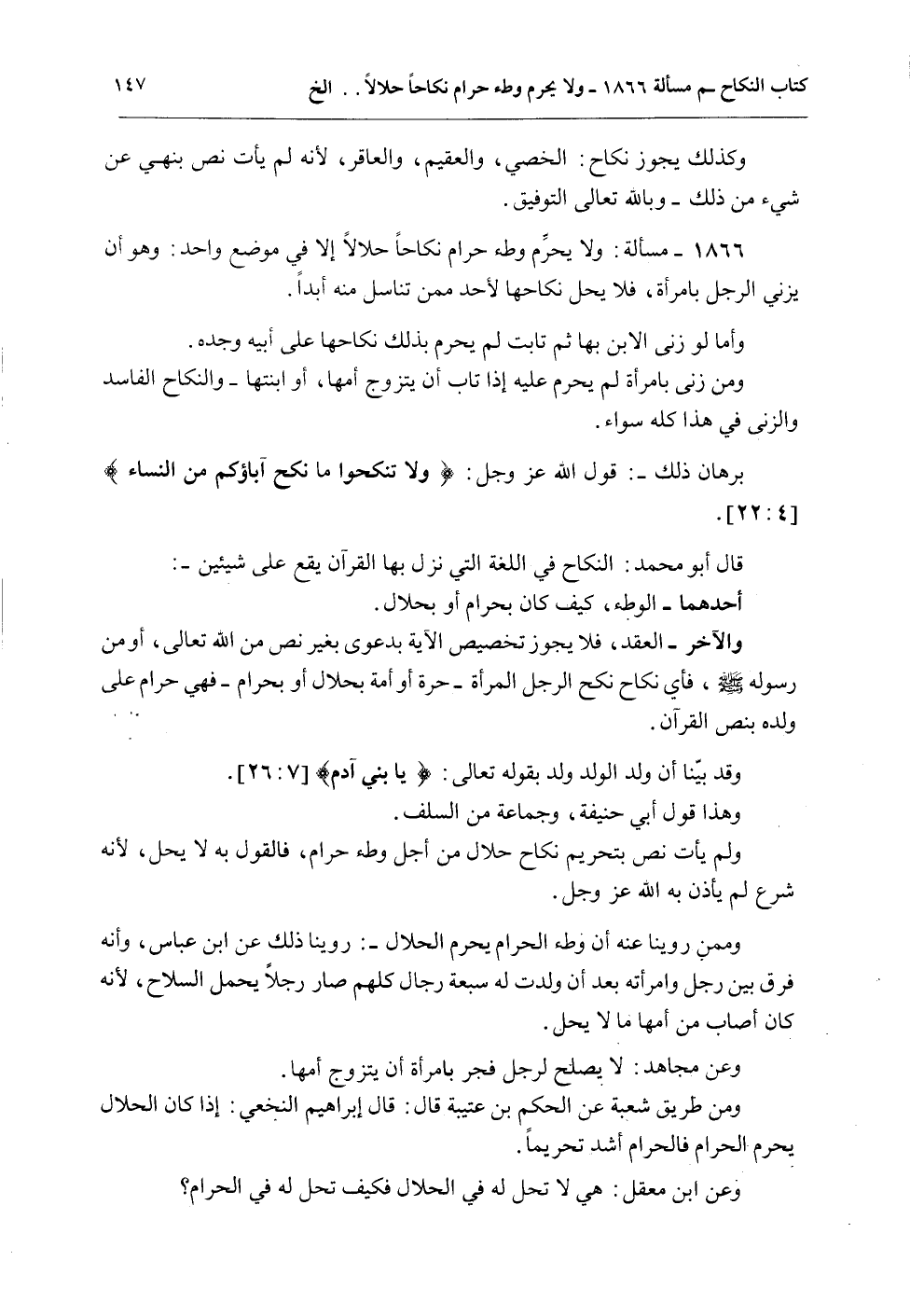 1866 - مَسْأَلَةٌ: وَلَا يُحَرَّمُ وَطْءُ حَرَامٍ نِكَاحًا حَلَالًا إلَّا فِي مَوْضِعٍ وَاحِدٍ: وَهُوَ أَنْ يَزْنِيَ الرَّجُلُ بِامْرَأَةٍ، فَلَا يَحِلُّ نِكَاحُهَا لِأَحَدٍ مِمَّنْ تَنَاسَلَ مِنْهُ أَبَدًا.