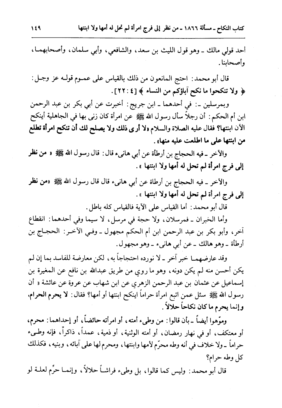 قَالَ أَبُو مُحَمَّدٍ: احْتَجَّ الْمَانِعُونَ مِنْ ذَلِكَ بِالْقِيَاسِ عَلَى عُمُومِ قَوْلِهِ عَزَّ وَجَلَّ: {وَلا تَنْكِحُوا مَا نَكَحَ آبَاؤُكُمْ مِنَ النِّسَاءِ} [النساء: 22] .
