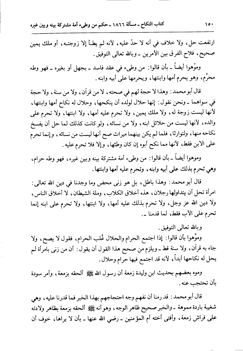 قَالَ أَبُو مُحَمَّدٍ: قَدْ رُمْنَا أَنْ نَفْهَمَ وَجْهَ احْتِجَاجِهِمْ بِهَذَا الْخَبَرِ فَمَا قَدَرْنَا عَلَيْهِ، وَهِيَ شَغِيبَةٌ بَارِدَةٌ مُمَوِّهَةٌ - وَالْخَبَرُ صَحِيحٌ ظَاهِرُ الْوَجْهِ، وَهُوَ أَنَّهُ - صَلَّى اللَّهُ عَلَيْهِ وَسَلَّمَ - أَلْحَقَهُ بِزَمْعَةَ بِظَاهِرِ وِلَادَتِهِ عَلَى فِرَاشِ زَمْعَةَ، وَأَفْتَى أُخْتَهُ أُمَّ الْمُؤْمِنِينَ - رَضِيَ اللَّهُ عَنْهَا - بِأَنْ لَا يَرَاهَا، خَوْفَ أَنْ