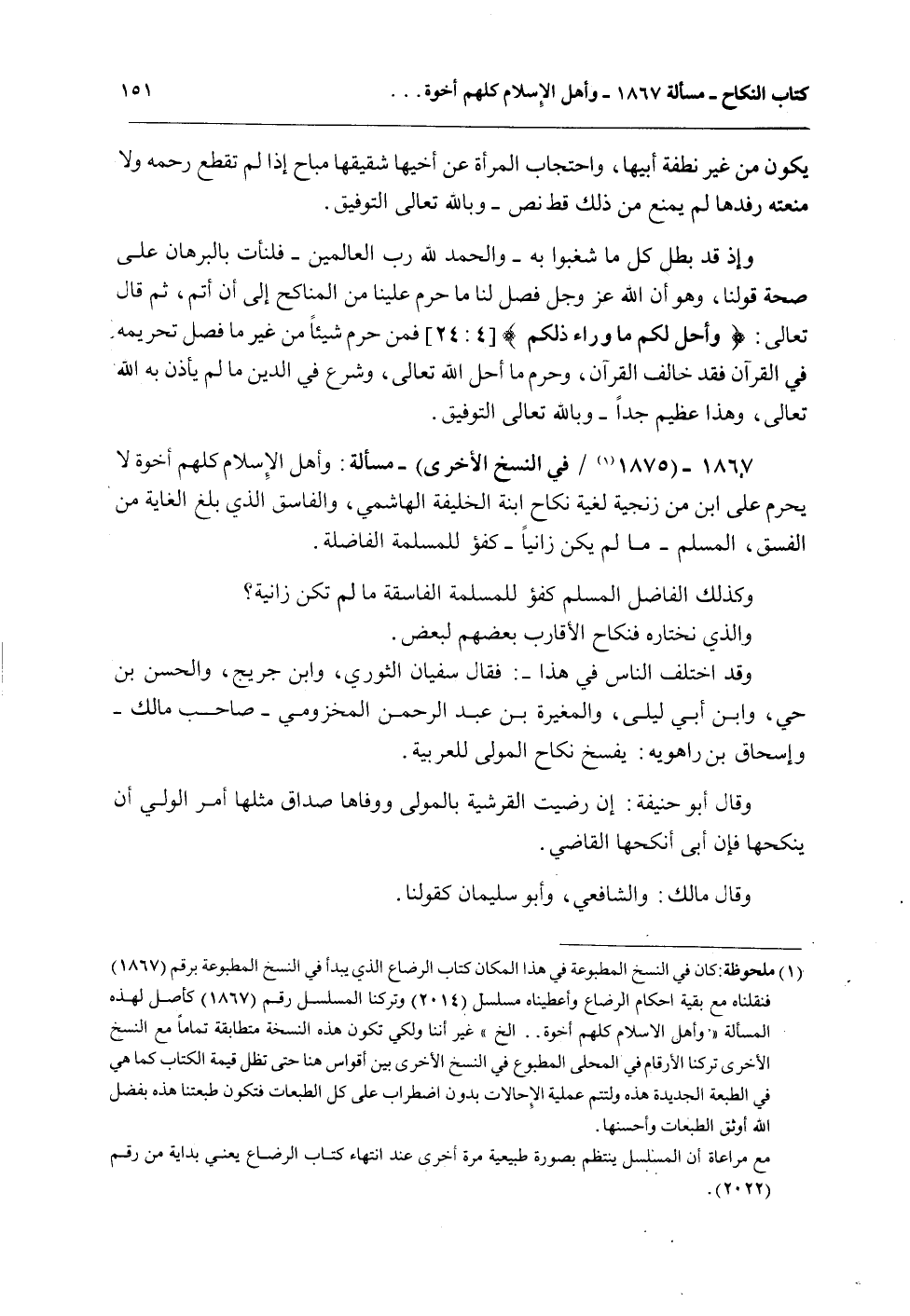 1867 - (1875 فِي النُّسَخِ الْأُخْرَى) - مَسْأَلَةٌ: وَأَهْلُ الْإِسْلَامِ كُلُّهُمْ إخْوَةٌ لَا يُحَرَّمُ عَلَى ابْنٍ مِنْ زِنْجِيَّةٍ لِغِيَّةٍ نِكَاحُ ابْنَةِ الْخَلِيفَةِ الْهَاشِمِيِّ. وَالْفَاسِقُ - الَّذِي بَلَغَ الْغَايَةَ مِنْ الْفِسْقِ - الْمُسْلِمُ - مَا لَمْ يَكُنْ زَانِيًا - كُفُؤٌ لِلْمُسْلِمَةِ الْفَاضِلَةِ.