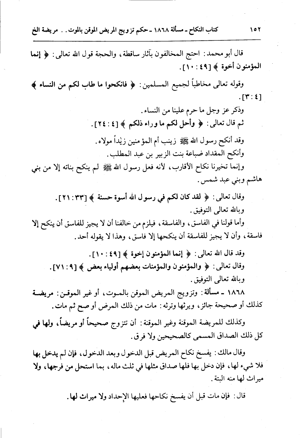 1868 - مَسْأَلَةٌ: وَتَزْوِيجُ الْمَرِيضِ الْمُوقِنِ بِالْمَوْتِ، أَوْ غَيْرِ الْمُوقِنِ: مَرِيضَةً كَذَلِكَ أَوْ صَحِيحَةً جَائِزٌ، وَيَرِثُهَا وَتَرِثُهُ: مَاتَ مِنْ ذَلِكَ الْمَرَضِ أَوْ صَحَّ ثُمَّ مَاتَ.